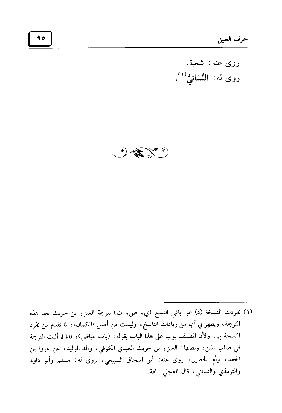 (¬١) تفردت النسخة (د) عن باقي النسخ (ي، ص، ث) بترجمة العيزار بن حريث بعد هذه الترجمة، ويظهر لي أنها من زيادات الناسخ، وليست من أصل "الكمال"؛ لما تقدم من تفرد النسخة بها، ولأن المصنف بوب على هذا الباب بقوله: (باب عياض)؛ لذا لم أثبت الترجمة في صلب المتن، ونصها: العيزار بن حريث العبدي الكوفي، والد الوليد، عن عروة بن الجعد، وأم الحصين، روى عنه: أبو إسحاق السبيعي، روي له: مسلم وأبو داود والترمذي والنسائي، قال العجلي: ثقة.