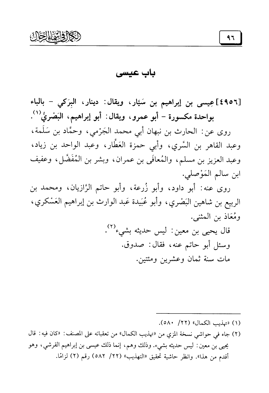(¬٢) جاء في حواشي نسخة المزي من "تهذيب الكمال" من تعقباته على المصنف: "كان فيه: قال يحيى بن معين: ليس حديثه بشيء. وذلك وهم، إنما ذلك عيسى بن إبراهيم القرشي، وهو أقدم من هذا". وانظر حاشية تحقيق "التهذيب" (٢٢/ ٥٨٢) رقم (٢) لزامًا.