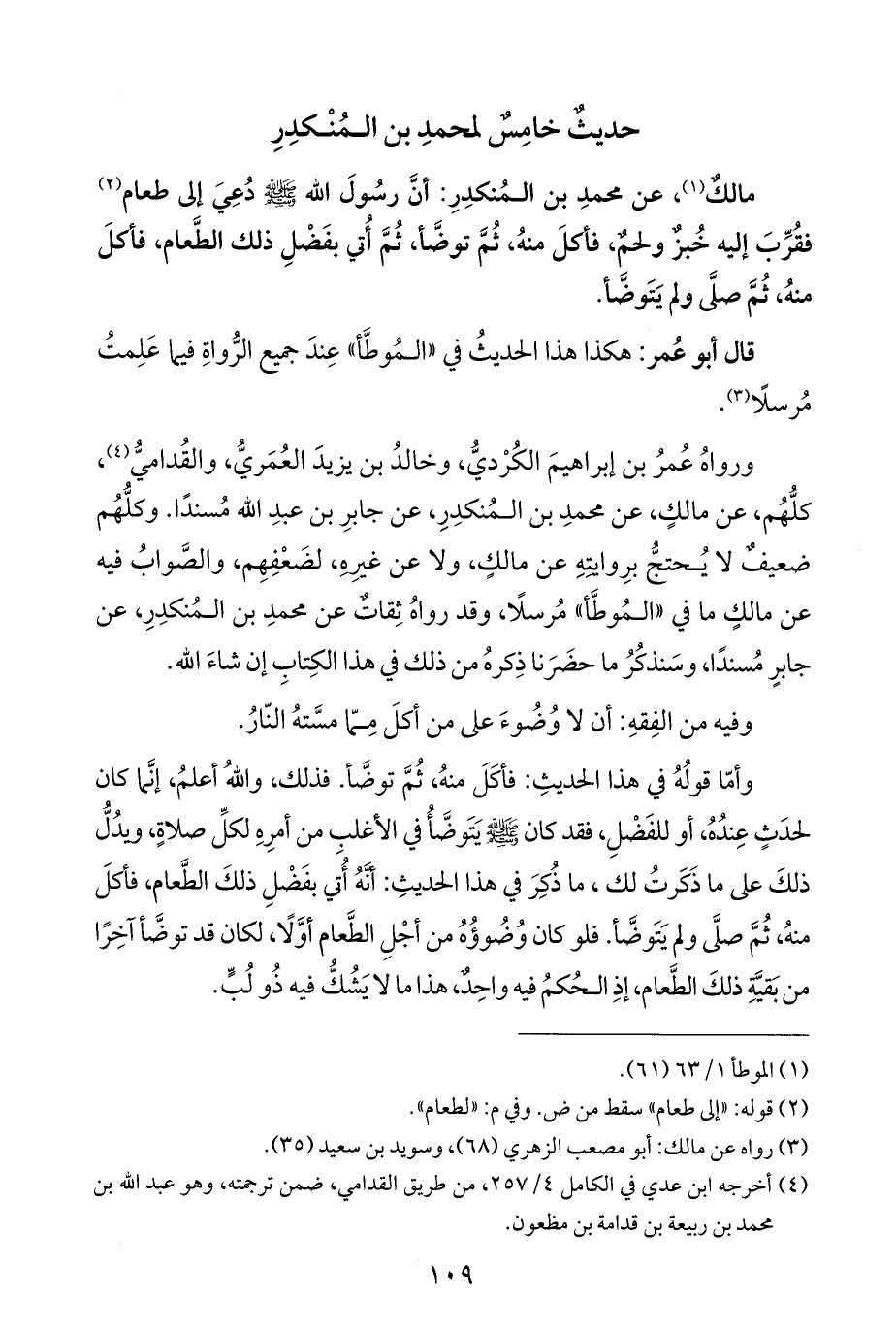 ورواهُ عُمرُ بن إبراهيمَ الكُرْديُّ، وخالدُ بن يزيدَ العُمَريُّ، والقُداميُّ (¬٤)، كلُّهُم، عن مالكٍ، عن محمدِ بن المُنكدِرِ، عن جابرِ بن عبدِ الله مُسندًا. وكلُّهُم ضعيفٌ لا يُحتجُّ برِوايتِهِ عن مالكٍ، ولا عن غيرِهِ، لضَعْفِهِم، والصوابُ فيه عن مالكٍ ما في "المُوطَّأ" مُرسلًا، وقد رواهُ ثِقاتٌ عن محمدِ بن المُنكدِرِ، عن جابرٍ مُسندًا، وسَنذكُرُ ما حضَرَنا ذِكرهُ من ذلك في هذا الكِتابِ إن شاءَ الله.