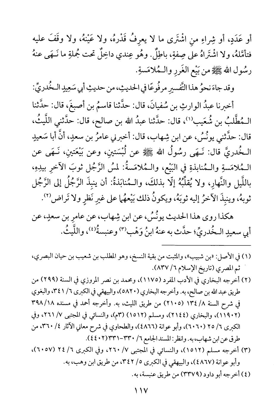 أخبرنا عبدُ الوارثِ بن سفيانَ، قال: حَدَّثَنَا قاسمُ بن أصبغَ، قال: حَدَّثَنَا المُطَّلبُ بن شُعَيب (¬١)، قال: حَدَّثَنَا عبدُ الله بن صالح، قال: حَدَّثَنِي اللَّيثُ، قال: حَدَّثَنِي يونُسُ، عن ابن شِهاب، قال: أخبرني عامرُ بن سعدٍ، أنَّ أبا سَعيدٍ الخُدريَّ قال: نَهَى رسُولُ الله - صَلَّى اللهُ عَلَيْهِ وَسَلَّمَ - عن لُبْسَتينِ، وعن بَيْعَتينِ، نَهَى عن المُلامَسةِ والمُنابذةِ في البَيْع، والمُلامَسةُ: لمسُ الرَّجُل ثوبَ الآخرِ بيدِهِ، باللَّيل والنَّهارِ، ولا يُقلِّبُهُ إلّا بذلكَ، والمُنابَذةُ: أن ينبِذَ الرَّجُلُ إلى الرَّجُل ثوبهُ، وينبِذَ الآخرُ إليه ثوبَهُ، ويكونُ ذلك بَيْعهُما على غيرِ نَظرٍ ولا تَراض (¬٢).