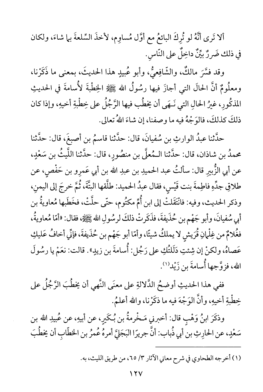 وقد فسَّرَ مالكٌ، والشّافِعيُّ، وأبو عُبيدٍ هذا الحديثَ، بمعنى ما ذَكَرْنا، ومعلُومٌ أنَّ الحالَ التي أجازَ فيها رسُولُ الله - صَلَّى اللهُ عَلَيْهِ وَسَلَّمَ - "الخِطْبةَ لأُسامةَ في الحديثِ المذكُورِ، غيرُ الحالِ التي نَهَى أن يخطُب فيها الرَّجُلُ على خِطْبةِ أخيهِ، وإذا كان ذلكَ كذلكَ، فالوَجْهُ فيه ما وصفنا، إن شاءَ اللهُ تعالى.