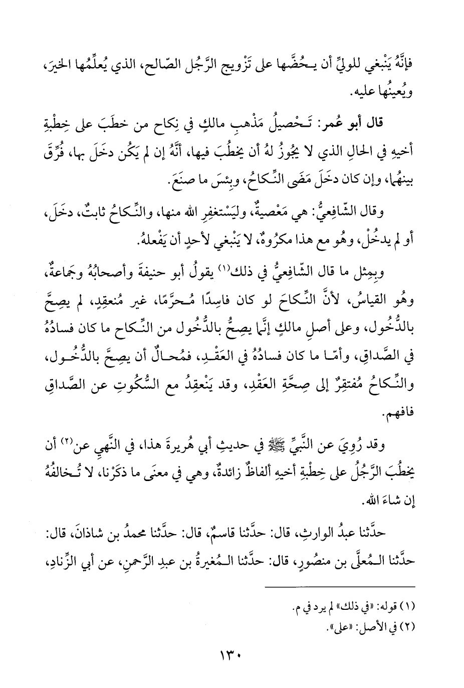 قال أبو عُمر: تَحْصيلُ مَذْهبِ مالكٍ في نِكاح من خطَبَ على خِطْبةِ أخيهِ في الحالِ الذي لا يجُوزُ لهُ أن يخطُبَ فيها، أنَّهُ إن لَمْ يَكُن دخَلَ بها، فُرِّقَ بينهُما، وإن كان دخَلَ مَضَى النِّكاحُ، وبِئسَ ما صنَعَ.