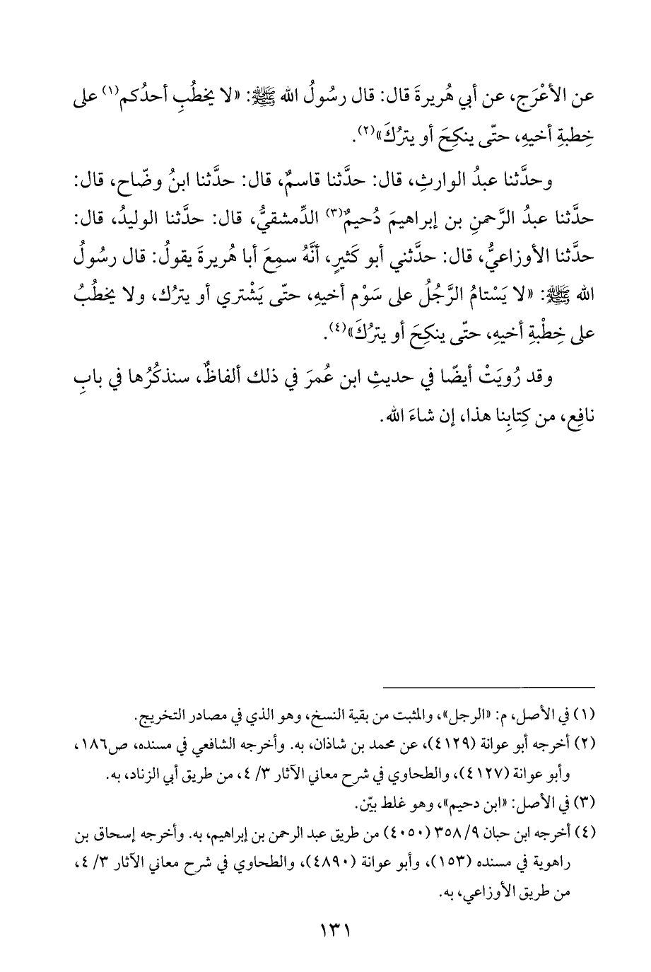 وحَدَّثَنَا عبدُ الوارثِ، قال: حَدَّثَنَا قاسمٌ، قال: حَدَّثَنَا ابنُ وضّاح، قال: حَدَّثَنَا عبدُ الرَّحمنِ بن إبراهيمَ دُحيمٌ (¬٣) الدِّمشقيُّ، قال: حَدَّثَنَا الوليدُ، قال: حَدَّثَنَا الأوزاعيُّ، قال: حَدَّثَنِي أبو كَثيرٍ، أنَّهُ سمِعَ أبا هُريرةَ يقولُ: قال رسُولُ الله - صَلَّى اللهُ عَلَيْهِ وَسَلَّمَ -: "لا يَسْتامُ الرَّجُلُ على سَوْم أخيهِ، حتَّى يَشْتري أو يترُك، ولا يخطُبُ على خِطْبةِ أخيهِ، حتَّى ينكِحَ أو يترُكَ" (¬٤).