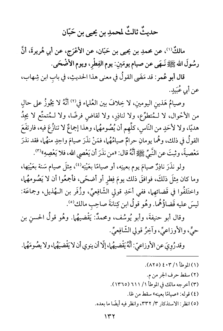 مالكٌ (¬١)، عن محمدِ بن يحيى بن حَبّان، عن الأعْرَج، عن أبي هُريرةَ، أنَّ رسُولَ الله - صَلَّى اللهُ عَلَيْهِ وَسَلَّمَ - نَهَى عن صيام يومَينِ: يوم الفِطْرِ، ويوم الأضْحَى.