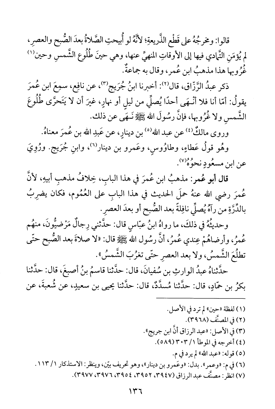 قال أبو عُمر: مذهبُ ابن عُمرَ في هذا البابِ، خِلافُ مذهبِ أبيهِ، لأنَّ عُمرَ رضي الله عنهُ حملَ الحديث في هذا البابِ على العُمُوم، فكان يضرِبُ بالدِّرَّةِ من رآهُ يُصلِّي نافِلةً بعد الصُّبح أو بعدَ العصرِ.