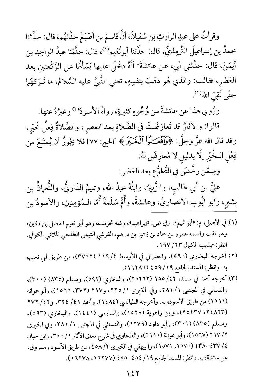 قالوا: والآثارُ قد تَعارَضَتْ في الصَّلاةِ بعد العصرِ، والصَّلاةُ فِعلُ خَيْرٍ، وقد قال الله عزَّ وجلَّ: {وَافْعَلُوا الْخَيْرَ} [الحج: ٧٧] فلا يجُوزُ أن يُمتَنعَ من فِعْلِ الخَيْرِ إلّا بدليلٍ لا مُعارِضَ لهُ.
