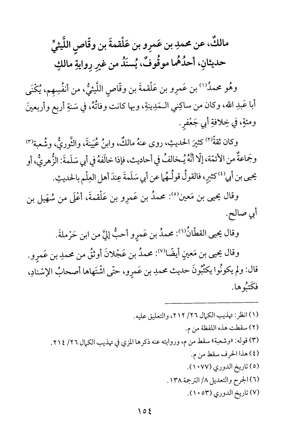 مالكٌ، عن محمدِ بن عَمرِو بن عَلْقمةَ بن وقّاصٍ اللَّيثيِّ حديثانِ، أحدُهُما موقُوفٌ، يُسنَدُ من غيرِ رِوايةِ مالكٍ