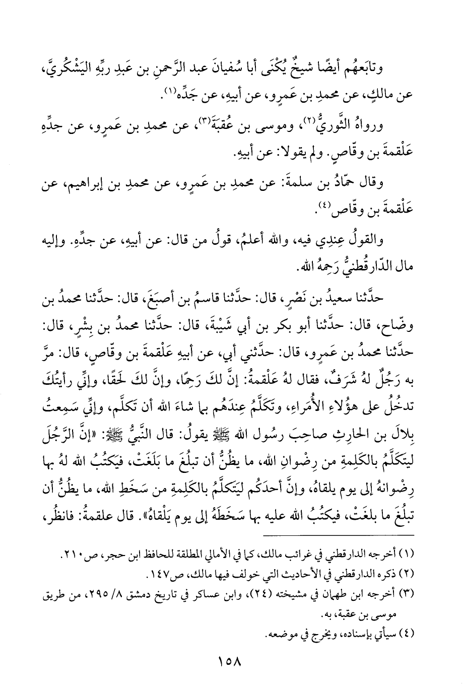 حَدَّثَنَا سعيدُ بن نَصْرٍ، قال: حَدَّثَنَا قاسمُ بن أصبَغَ، قال: حَدَّثَنَا محمدُ بن وضّاح، قال: حَدَّثَنَا أبو بكر بن أبي شَيْبةَ، قال: حَدَّثَنَا محمدُ بن بِشْرٍ، قال: حَدَّثَنَا محمدُ بن عَمرٍو، قال: حَدَّثَنِي أبي، عن أبيهِ عَلْقمةَ بن وقّاصٍ، قال: مرَّ به رَجُلٌ لهُ شَرَفٌ، فقال لهُ عَلْقمةُ: إنَّ لكَ رَحِمًا، وإنَّ لكَ لحَقًا، وإنِّي رأيتُكَ تدخُلُ على هؤُلاءِ الأُمَراءِ، وتَكَلَّمُ عِندَهُم بما شاءَ الله أن تَكلَّم، وإنِّي سَمِعتُ بِلالَ بن الحارِثِ صاحِبَ رسُول الله - صَلَّى اللهُ عَلَيْهِ وَسَلَّمَ - يقولُ: قال النَّبيُّ - صَلَّى اللهُ عَلَيْهِ وَسَلَّمَ -: "إنَّ الرَّجُلَ ليتكَلَّمُ بالكَلِمةِ من رِضْوانِ الله، ما يظُنُّ أن تبلُغَ ما بَلَغَتْ، فيَكتُبُ الله لهُ بها رِضْوانهُ إلى يوم يلقاهُ، وإنَّ أحدَكُم ليَتكلَّمُ بالكَلِمةِ من سَخَطِ الله، ما يظُنُّ أن تبلُغَ ما بلغَتْ، فيكتُبُ الله عليه بها سَخَطَهُ إلى يوم يَلْقاهُ". قال علقمةُ: فانظُر،