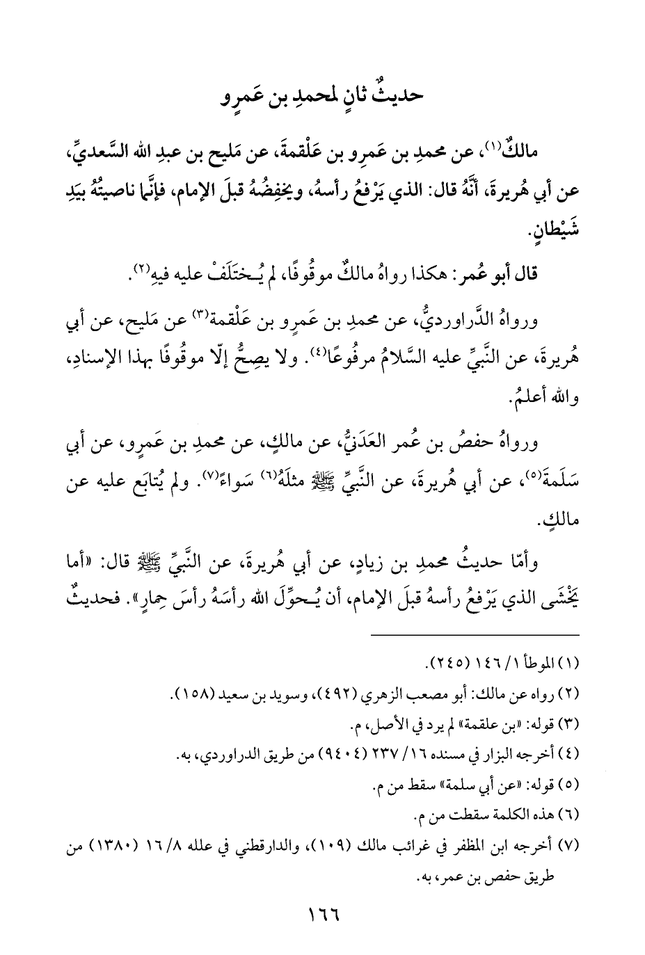 مالكٌ (¬١)، عن محمدِ بن عَمرِو بن عَلْقمةَ، عن مَليح بن عبدِ الله السَّعديِّ، عن أبي هُريرةَ، أنَّهُ قال: الذي يَرْفعُ رأسهُ، ويخفِضُهُ قبلَ الإمام، فإنَّما ناصيتُهُ بيَدِ شَيْطانٍ.