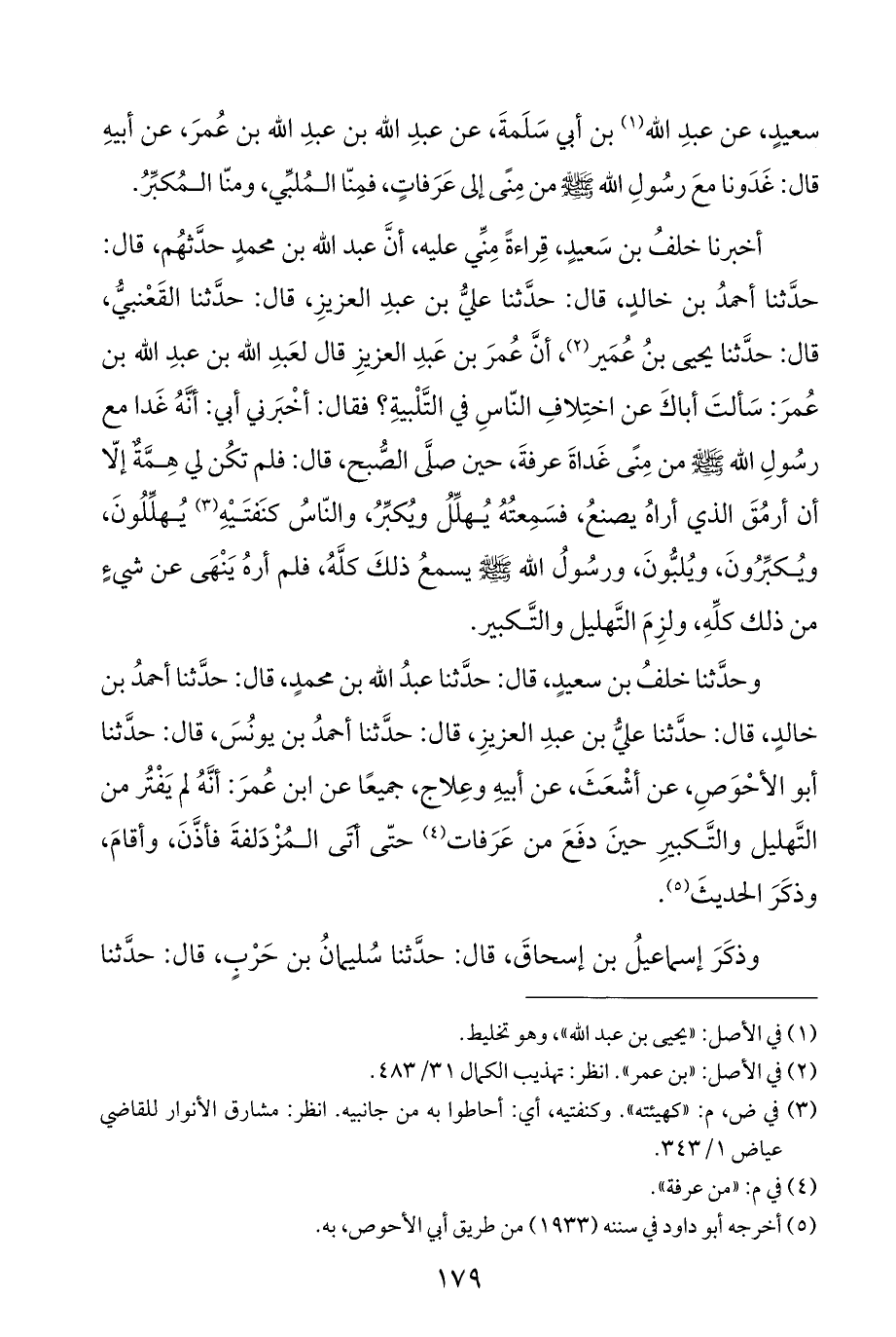 أخبرنا خلفُ بن سَعيدٍ، قِراءةً مِنِّي عليه، أنَّ عبد الله بن محمدٍ حدَّثهُم، قال: حدَّثنا أحمدُ بن خالدٍ، قال: حدَّثنا عليُّ بن عبدِ العزيزِ، قال: حدَّثنا القَعْنبيُّ، قال: حدَّثنا يحيى بنُ عُمَير (¬٢)، أنَّ عُمرَ بن عَبدِ العزيزِ قال لعَبدِ الله بن عبدِ الله بن عُمرَ: سَألتَ أباكَ عن اختِلافِ النّاسِ في التَّلْبيةِ؟ فقال: أخْبَرني أبي: أنَّهُ غَدا مع رسُولِ الله - صلى الله عليه وسلم - من مِنًى غَداةَ عرفةَ، حين صلَّى الصُّبح، قال: فلم تكُن لي هِمَّةٌ إلّا أن أرمُقَ الذي أراهُ يصنعُ، فسَمِعتُهُ يُهلِّلُ ويُكبِّرُ، والنّاسُ كنَفتَيْهِ (¬٣) يُهلِّلُونَ، ويُكبِّرُونَ، ويُلبُّونَ، ورسُولُ الله - صلى الله عليه وسلم - يسمعُ ذلكَ كلَّهُ، فلم أرهُ يَنْهَى عن شيءٍ من ذلك كلِّهِ، ولزِمَ التَّهليل والتَّكبير.
