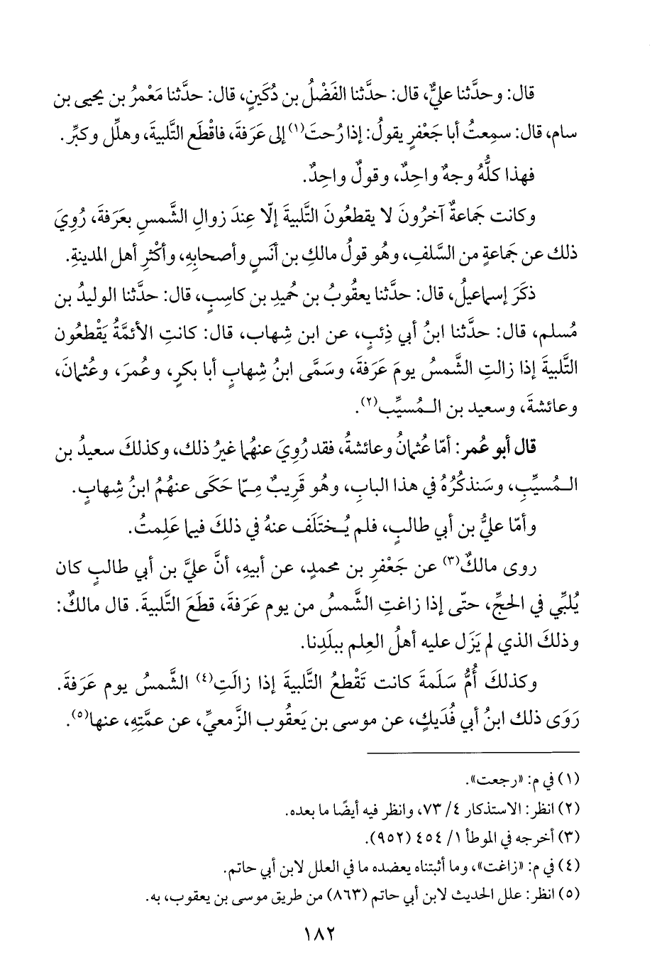 ذكَرَ إسماعيلُ، قال: حدَّثنا يعقُوبُ بن حُميدِ بن كاسِبٍ، قال: حدَّثنا الوليدُ بن مُسلم، قال: حدَّثنا ابنُ أبي ذِئبٍ، عن ابن شِهاب، قال: كانتِ الأئمَّةُ يَقْطعُون التَّلبيةَ إذا زالتِ الشَّمسُ يومَ عَرَفةَ، وسَمَّى ابنُ شِهابٍ أبا بكرٍ، وعُمرَ، وعُثمانَ، وعائشةَ، وسعيد بن المُسيِّب (¬٢).