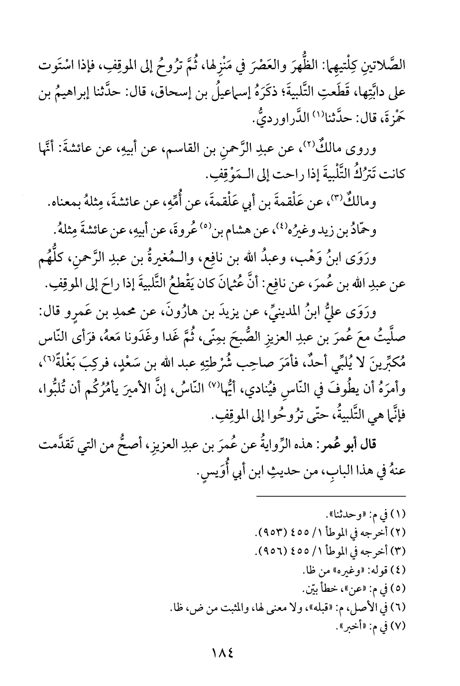 ورَوَى ابنُ وَهْب، وعبدُ الله بن نافِع، والمُغيرةُ بن عبدِ الرَّحمنِ، كلُّهُم عن عبدِ الله بن عُمرَ، عن نافِع: أنَّ عُثمانَ كان يَقْطعُ التَّلبيةَ إذا راحَ إلى الموقِفِ.