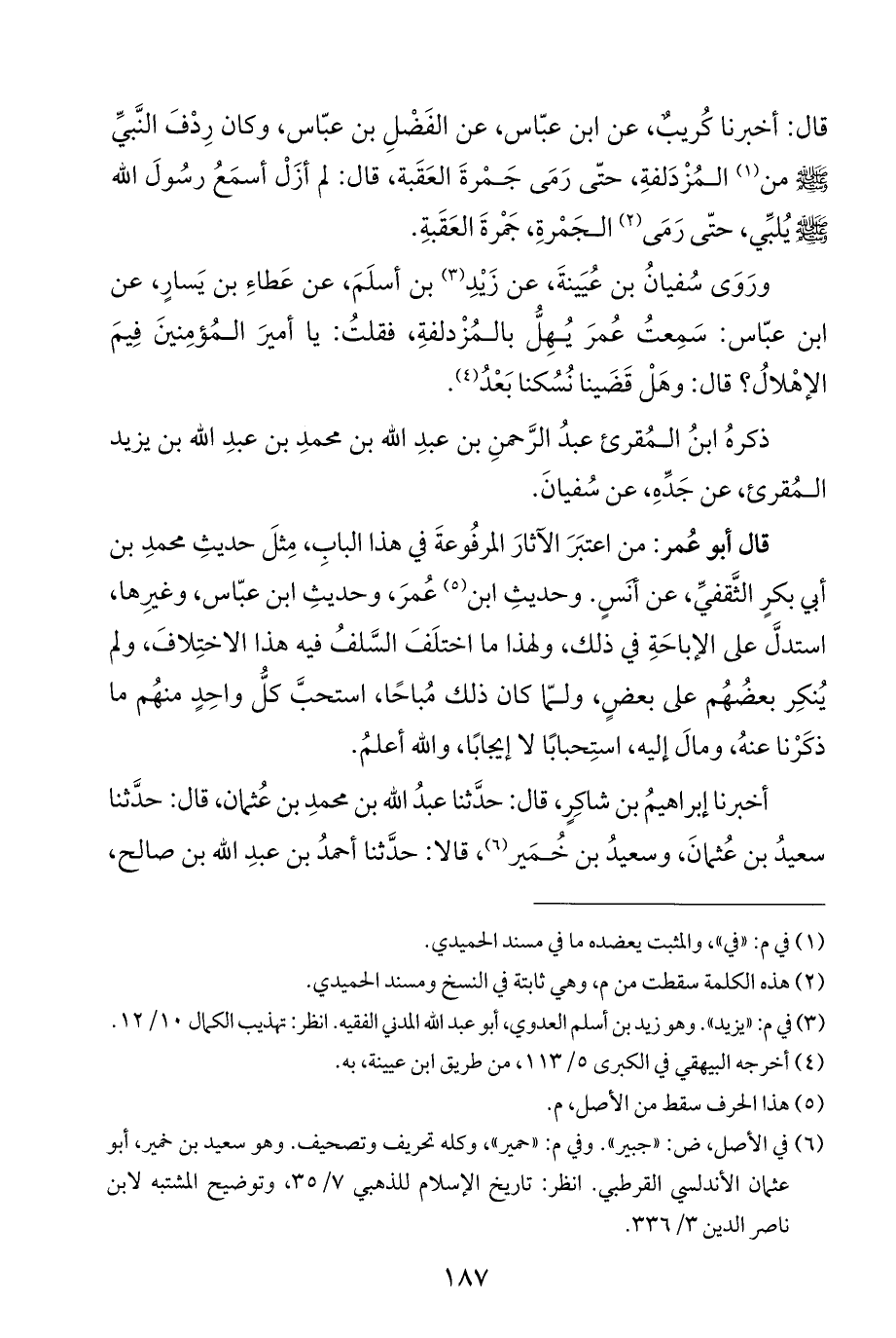 ورَوَى سُفيانُ بن عُيَينةَ، عن زَيْدِ (¬٣) بن أسلَمَ، عن عَطاءِ بن يَسارٍ، عن ابن عبّاس: سَمِعتُ عُمرَ يُهِلُّ بالمُزْدلفةِ، فقلتُ: يا أميرَ المُؤمِنينَ فِيمَ الإهْلالُ؟ قال: وهَلْ قَضَينا نُسُكنا بَعْدُ (¬٤).