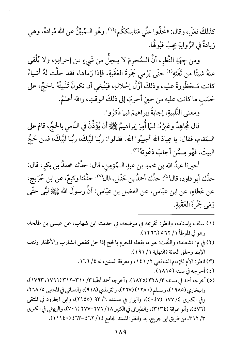 أخبرنا عبدُ الله بن محمدِ بن عبدِ المُؤمِنِ، قال: حدَّثنا محمدُ بن بكرٍ، قال: حدَّثنا أبو داود، قال (¬٤): حدَّثنا أحمدُ بن حَنْبل، قال (¬٥): حدَّثنا وكيعٌ، عن ابن جُرَيج، عن عَطاءٍ، عن ابن عبّاس، عن الفضل بن عبّاس: أنَّ رسولَ الله - صلى الله عليه وسلم - لبَّى حتَّى رَمَى جَمْرةَ العَقَبةِ.