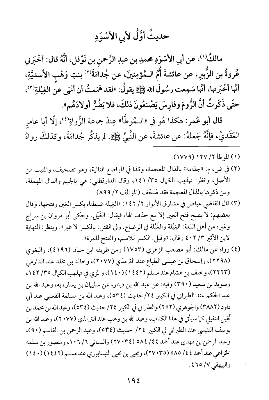 مالكٌ (¬١)، عن أبي الأسْوَدِ محمدِ بن عبدِ الرَّحمنِ بن نَوْفل، أنَّهُ قال: أخْبَرني عُروةُ بن الزُّبير، عن عائشةَ أمِّ المُؤمِنينَ، عن جُدامَةَ (¬٢) بنتِ وَهْبٍ الأسديَّةِ، أنَّها أخْبَرتها، أنَّها سَمِعت رسُولَ الله - صلى الله عليه وسلم - يقولُ: "لقد هَمَمتُ أن أنْهَى عنَ الغِيْلةِ (¬٣)، حتَّى ذَكرتُ أنَّ الرُّومَ وفارِسَ يَصْنعُونَ ذلكَ، فلا يَضُرُّ أولادَهُم".