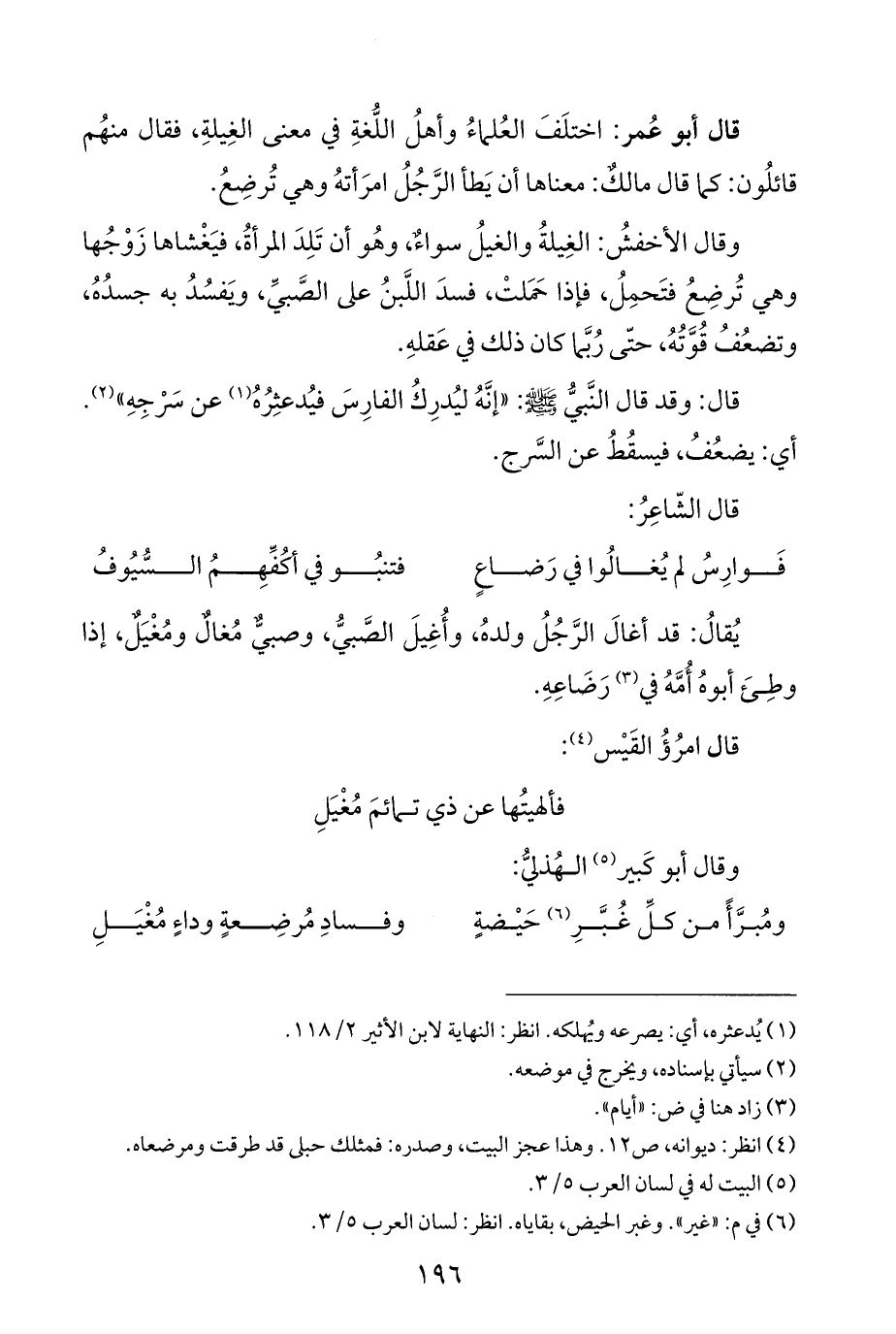 وقال الأخفشُ: الغِيلةُ والغيلُ سواءٌ، وهُو أن تَلِدَ المرأةُ، فيَغْشاها زَوْجُها وهي تُرضِعُ فتَحمِلُ، فإذا حَمَلتْ، فسدَ اللَّبنُ على الصَّبيِّ، ويَفسُدُ به جسدُهُ، وتضعُفُ قُوَّتُهُ، حتَّى رُبَّما كان ذلك في عَقلهِ.