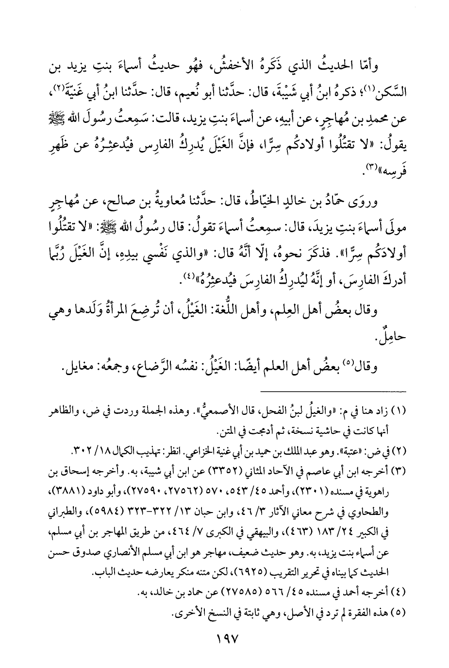 وروَى حمّادُ بن خالدٍ الخيّاطُ، قال: حدَّثنا مُعاويةُ بن صالح، عن مُهاجِرٍ مولَى أسماءَ بنتِ يزيدَ، قال: سمِعتُ أسماءَ تقولُ: قال رسُولُ الله - صلى الله عليه وسلم -: "لا تقتُلُوا أولادَكُم سِرًّا". فذكَرَ نحوهُ، إلّا أنَّهُ قال: "والذي نَفْسي بيدِهِ، إنَّ الغَيْلَ رُبَّما أدركَ الفارِسَ، أو إنَّهُ ليُدرِكُ الفارِسَ فيُدعثِرُهُ" (¬٤).