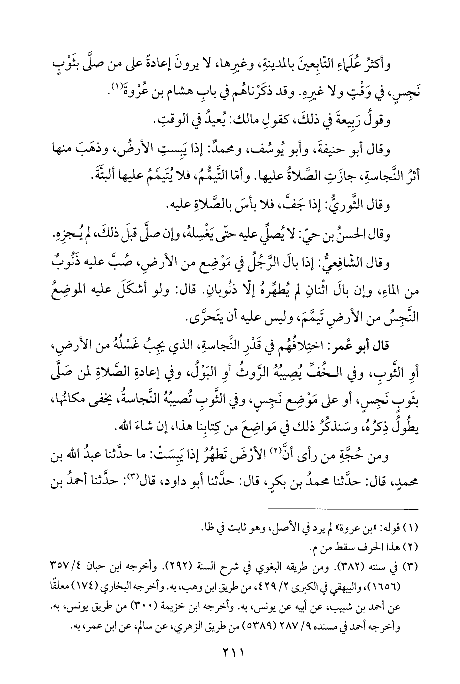 قال أبو عُمر: اختِلافُهُم في قَدْرِ النَّجاسةِ، الذي يجِبُ غَسْلُهُ من الأرضِ، أوِ الثَّوبِ، وفي الخُفِّ يُصيبُهُ الرَّوثُ أوِ البَوْلُ، وفي إعادةِ الصَّلاةِ لمن صَلَّى بثَوبٍ نَجِسٍ، أو على مَوْضِع نَجِسٍ، وفي الثَّوبِ تُصيبُهُ النَّجاسةُ، يخفى مكانُها، يطُولُ ذِكرُهُ، وسَنذكُرُ ذلك في مَواضِعَ من كِتابِنا هذا، إن شاءَ الله.