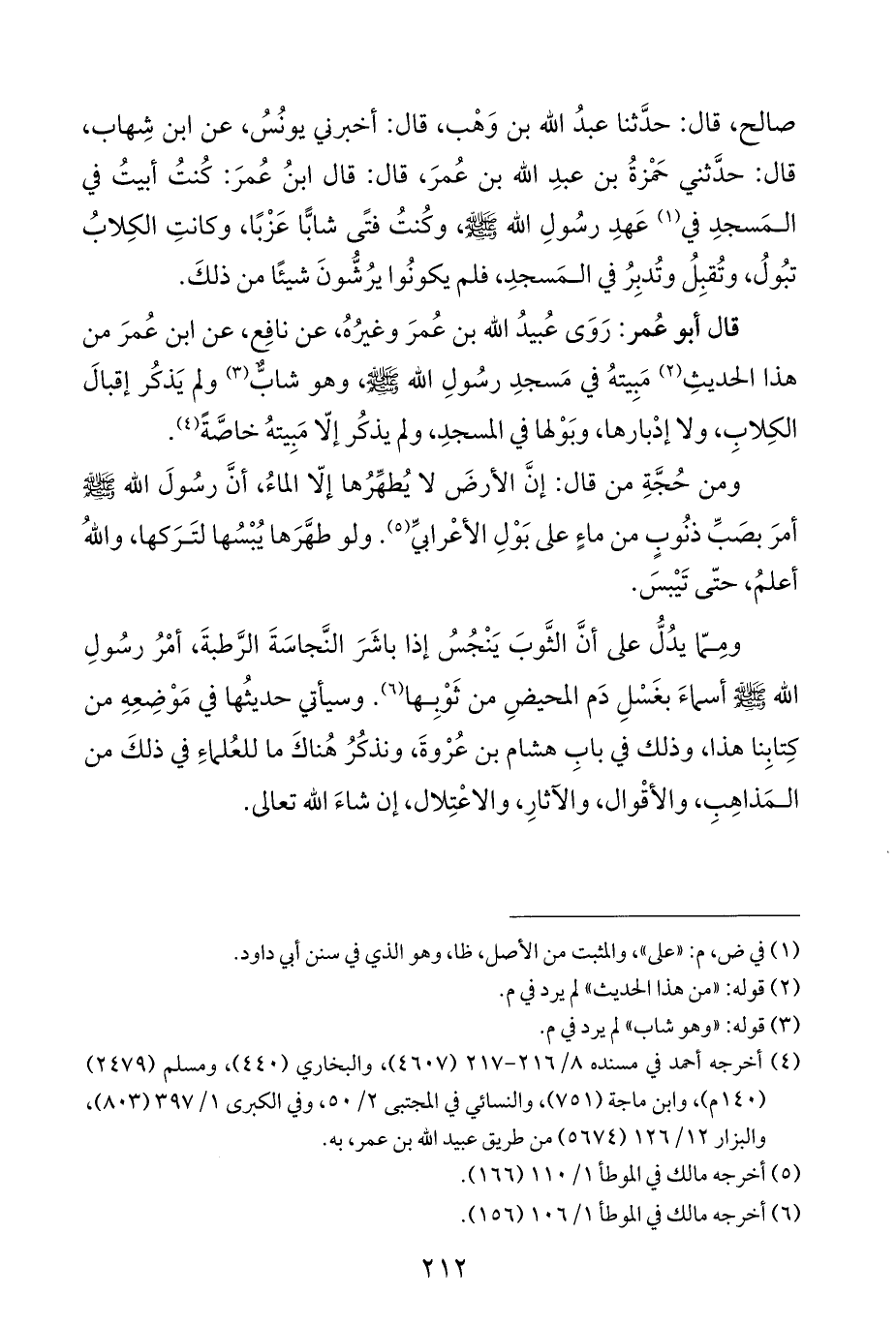 قال أبو عُمر: رَوَى عُبيدُ الله بن عُمرَ وغيرُهُ، عن نافِع، عن ابن عُمرَ من هذا الحديثِ (¬٢) مَبِيتهُ في مَسجدِ رسُولِ الله - صلى الله عليه وسلم -، وهو شابٌّ (¬٣) ولم يَذكُر إقبالَ الكِلابِ، ولا إدْبارها، وبَوْلها في المسجدِ، ولم يذكُر إلّا مَبِيتهُ خاصَّةً (¬٤).
