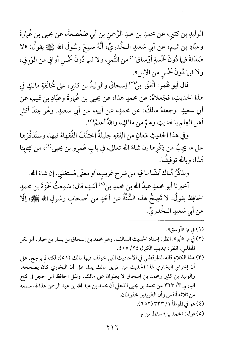 الوليدِ بن كثيرٍ، عن محمدِ بن عبدِ الرَّحمنِ بن أبي صَعْصعةَ، عن يحيى بن عُمارةَ وعبّادِ بن تميم، عن أبي سَعيدٍ الخُدريِّ، أنَّهُ سمِعَ رسُولَ الله - صلى الله عليه وسلم - يقولُ: "لا صَدَقةَ فيما دُونَ خَمْسةِ أوْساق (¬١) من التَّمرِ، ولا فيما دُونَ خَمْسِ أواقٍ من الوَرِقِ، ولا فيما دُونَ خَمْسٍ من الإبِل".