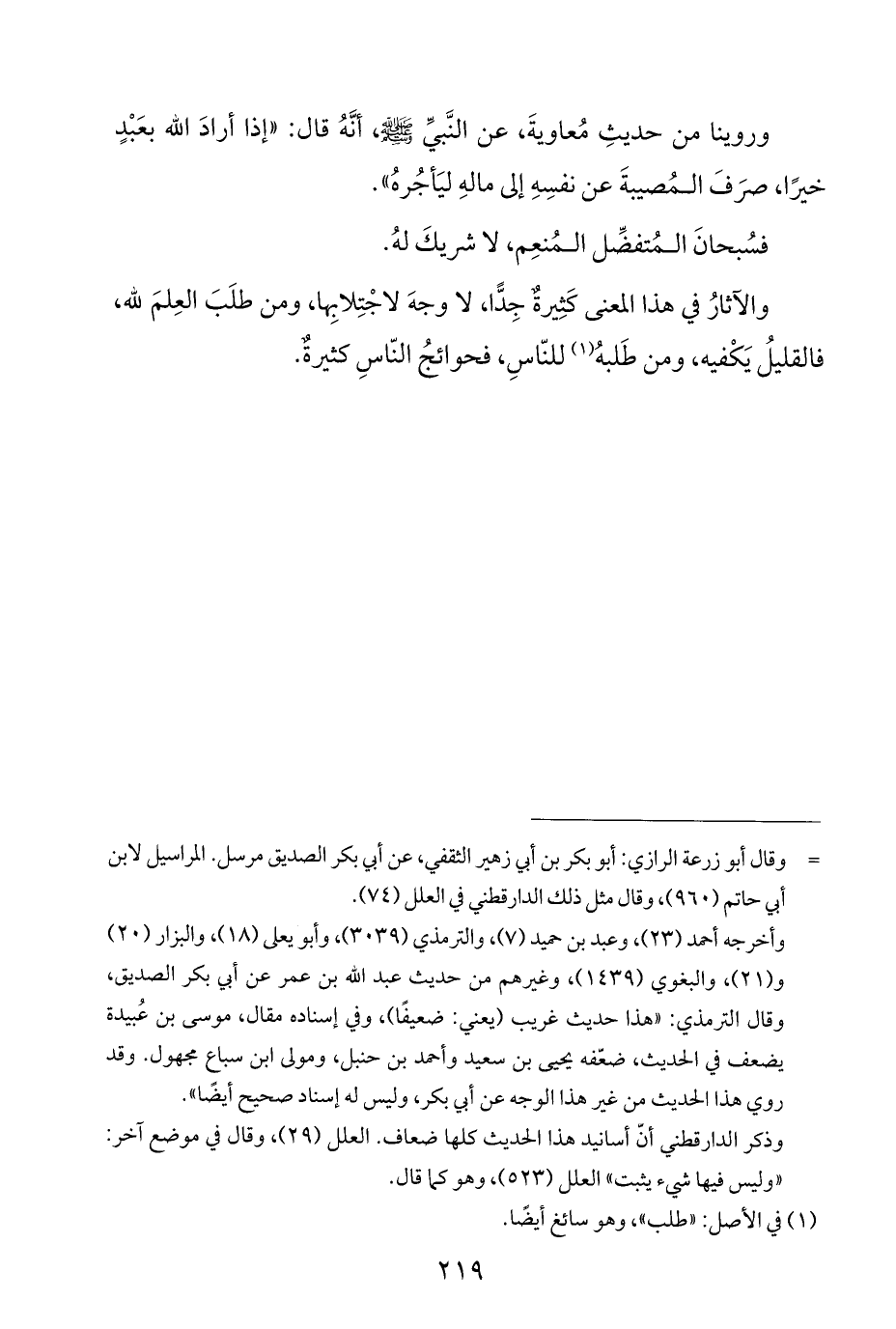 وروينا من حديثِ مُعاويةَ، عن النَّبيِّ - صلى الله عليه وسلم -، أنَّهُ قال: "إذا أرادَ الله بعَبْدٍ خيرًا، صرَفَ المُصيبةَ عن نفسِهِ إلى مالهِ ليَأجُرهُ".