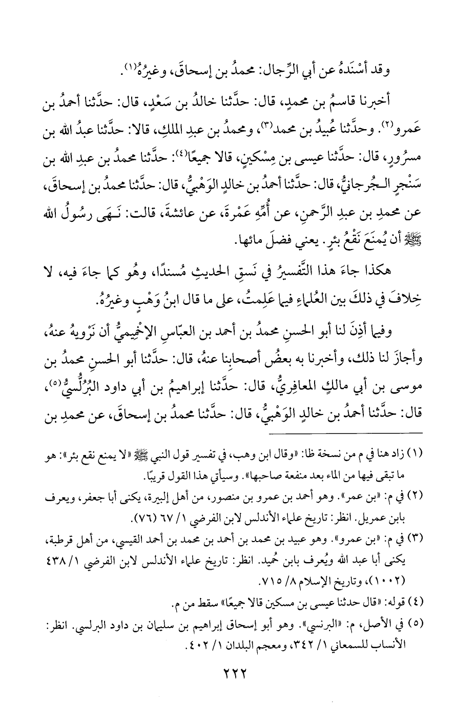 أخبرنا قاسمُ بن محمدٍ، قال: حدَّثنا خالدُ بن سَعْدٍ، قال: حدَّثنا أحمدُ بن عَمرو (¬٢). وحدَّثنا عُبيدُ بن محمد (¬٣)، ومحمدُ بن عبدِ الملكِ، قالا: حدَّثنا عبدُ الله بن مسرُورٍ، قال: حدَّثنا عيسى بن مِسْكينٍ، قالا جميعًا (¬٤): حدَّثنا محمدُ بن عبدِ الله بن سَنْجرٍ الجُرجانيُّ، قال: حدَّثنا أحمدُ بن خالدٍ الوَهْبيُّ، قال: حدَّثنا محمدُ بن إسحاقَ، عن محمدِ بن عبدِ الرَّحمنِ، عن أُمِّهِ عَمْرةَ، عن عائشةَ، قالت: نَهَى رسُولُ الله - صلى الله عليه وسلم - أن يُمنَعَ نَقْعُ بئرٍ. يعني فضلَ مائها.
