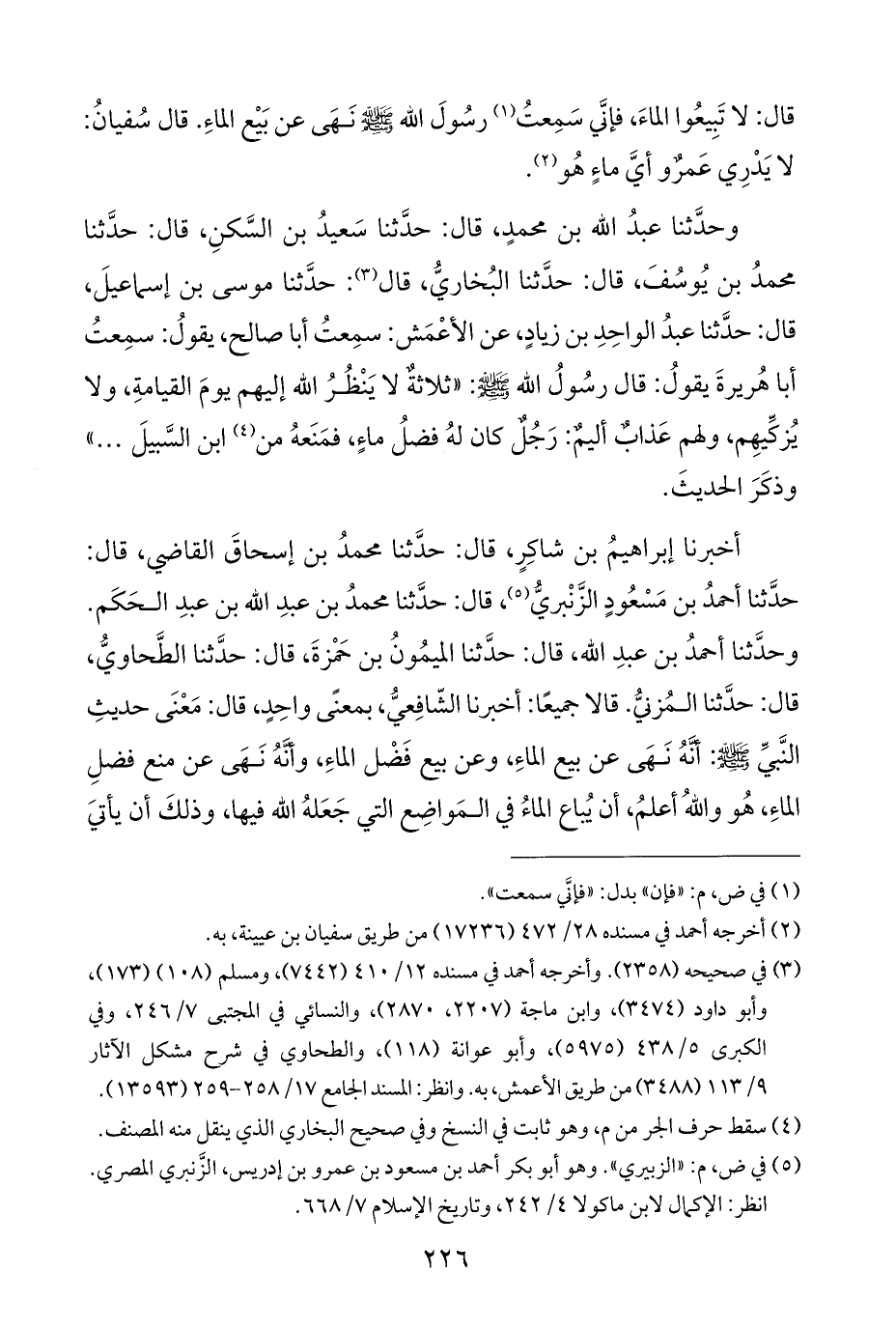 وحدَّثنا عبدُ الله بن محمدٍ، قال: حدَّثنا سَعيدُ بن السَّكنِ، قال: حدَّثنا محمدُ بن يُوسُفَ، قال: حدَّثنا البُخاريُّ، قال (¬٣): حدَّثنا موسى بن إسماعيلَ، قال: حدَّثنا عبدُ الواحِدِ بن زيادٍ، عن الأعْمَش: سمِعتُ أبا صالح، يقولُ: سمِعتُ أبا هُريرةَ يقولُ: قال رسُولُ الله - صلى الله عليه وسلم -: "ثلاثةٌ لا يَنْظُرُ الله إليهم يومَ القيامةِ، ولا يُزكِّيهِم، ولهم عَذاب أليمٌ: رَجُلٌ كان لهُ فضلُ ماءٍ، فمَنَعهُ من (¬٤) ابن السَّبيلَ ... " وذكَرَ الحديثَ.
