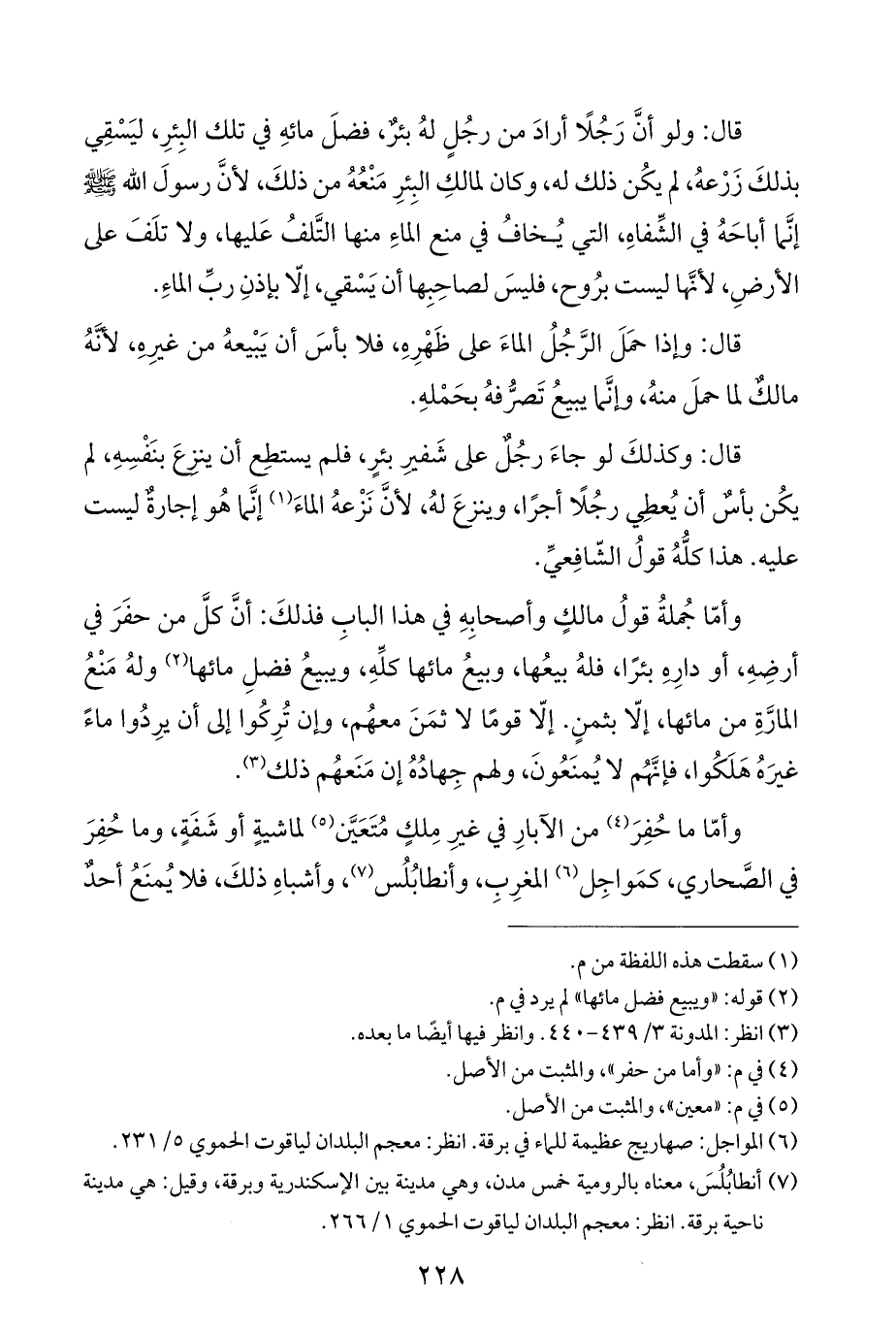 وأمّا ما حُفِرَ (¬٤) من الآبارِ في غيرِ مِلكٍ مُتَعَيَّن (¬٥) لماشيةٍ أو شَفَةٍ، وما حُفِرَ في الصَّحاري، كمَواجِل (¬٦) المغرِبِ، وأنطابُلُس (¬٧)، وأشباهِ ذلكَ، فلا يُمنَعُ أحدٌ
