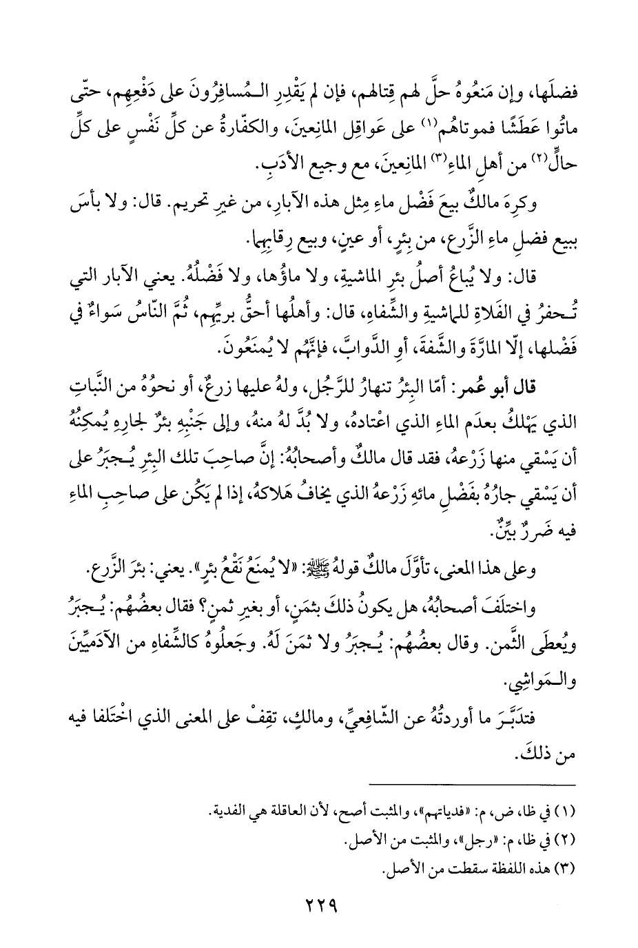 قال: ولا يُباعُ أصلُ بئرِ الماشيةِ، ولا ماؤُها، ولا فَضْلُهُ. يعني الآبار التي تُحفرُ في الفَلاةِ للماشيةِ والشِّفاهِ، قال: وأهلُها أحقُّ بريِّهِم، ثُمَّ النّاسُ سَواءٌ في فَضْلها، إلّا المارَّةَ والشَّفةَ، أوِ الدَّوابَّ، فإنَّهُم لا يُمنَعُونَ.