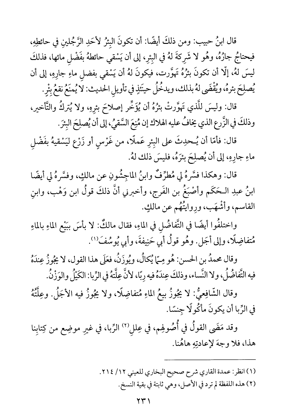 قال ابنُ حبيب: ومن ذلكَ أيضًا: أن تكونَ البِئرُ لأحَدِ الرَّجُلينِ في حائطِهِ، فيحتاجُ جارُهُ، وهُو لا شرِكةَ لهُ في البِئرِ، إلى أن يَسْقي حائطهُ بفَضْلِ مائها، فذلكَ ليسَ لهُ، إلّا أن تكونَ بئرُهُ تَهوَّرت، فيكونَ لهُ أن يَسْقي بفضلِ ماءِ جارِهِ، إلى أن يُصلِحَ بئرهُ، ويُقضَى لهُ بذلك، ويدخُلُ حينَئذٍ في تأويلِ الحديث: لا يُمنَعُ نقعُ بِئْرٍ.