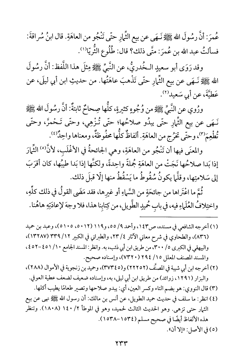 ورُوي عن النَّبيِّ - صلى الله عليه وسلم - من وُجُوهٍ كثيرِةٍ، كلُّها صِحاحٌ ثابتةٌ: أنَّ رسُولَ الله - صلى الله عليه وسلم - نَهَى عن بيع الثِّمارِ حتَّى يبدُو صلاحُها؛ حتَّى تُزْهِي، وحتّى تَحْمرَّ، وحتّى تُطْعِمَ (¬٣)، وحتّى تخرُج من العاهَةِ. ألفاظٌ كلُّها محفُوظةٌ، ومعناها واحِدٌ (¬٤).