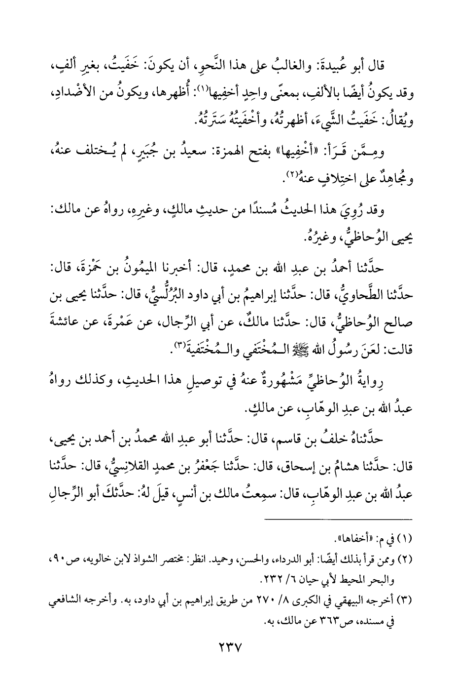حدَّثنا أحمدُ بن عبدِ الله بن محمدٍ، قال: أخبرنا الميمُونُ بن حَمْزةَ، قال: حدَّثنا الطَّحاويُّ، قال: حدَّثنا إبراهيمُ بن أبي داود البُرُلُّسيُّ، قال: حدَّثنا يحيى بن صالح الوُحاظيُّ، قال: حدَّثنا مالكٌ، عن أبي الرِّجال، عن عَمْرةَ، عن عائشةَ قالت: لعَنَ رسُولُ الله - صلى الله عليه وسلم - المُخْتَفي والمُخْتَفيةَ (¬٣).
