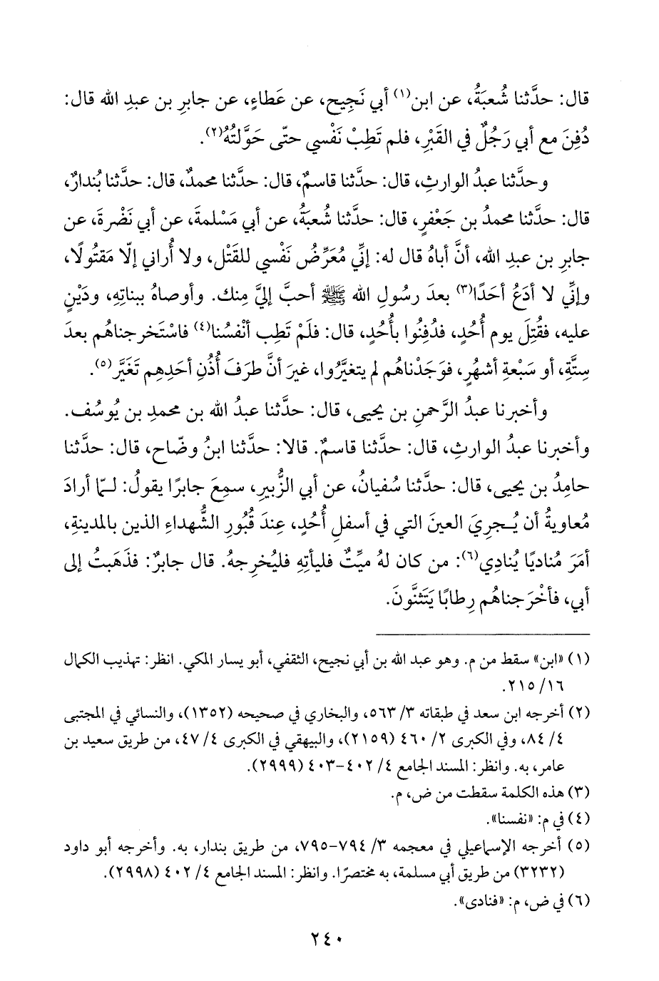 وأخبرنا عبدُ الرَّحمنِ بن يحيى، قال: حدَّثنا عبدُ الله بن محمدِ بن يُوسُف. وأخبرنا عبدُ الوارثِ، قال: حدَّثنا قاسمٌ. قالا: حدَّثنا ابنُ وضّاح، قال: حدَّثنا حامِدُ بن يحيى، قال: حدَّثنا سُفيانُ، عن أبي الزُّبيرِ، سمِعَ جابرًا يقولُ: لمّا أرادَ مُعاويةُ أن يُجرِيَ العينَ التي في أسفلِ أُحُدٍ، عِندَ قُبُورِ الشُّهداءِ الذين بالمدينةِ، أمَرَ مُناديًا يُنادِي (¬٦): من كان لهُ ميِّت فليأتِهِ فليُخرِجهُ. قال جابرٌ: فذَهَبتُ إلى أبي، فأخْرَجناهُم رِطابًا يَتَثنَّونَ.