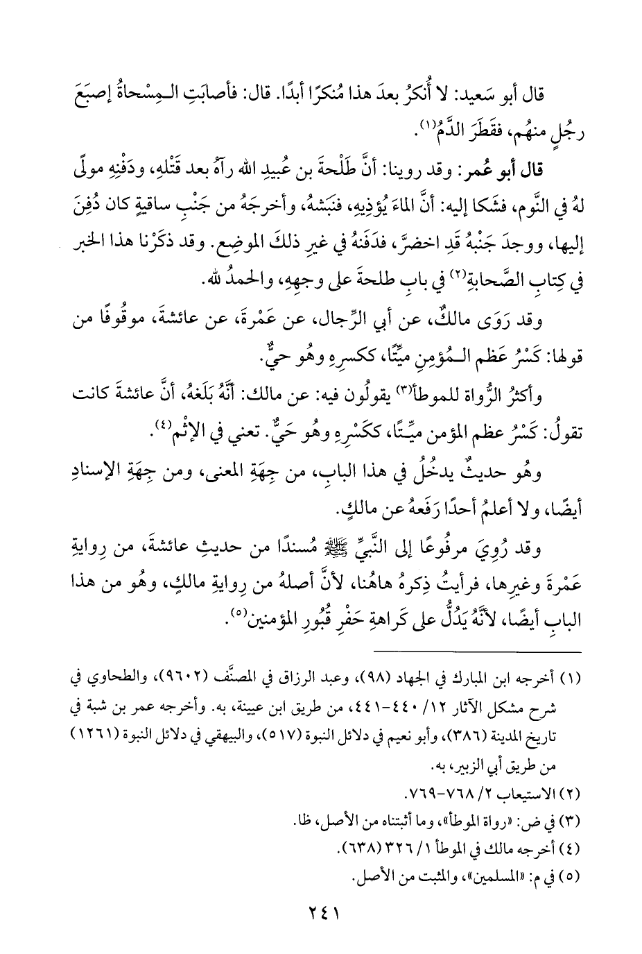 وأكثرُ الرُّواة للموطأ (¬٣) يقولُون فيه: عن مالك: أنَّهُ بَلَغهُ، أنَّ عائشةَ كانت تقولُ: كَسْرُ عظم المؤمن ميِّتًا، ككَسْرِهِ وهُو حَيٌّ. تعني في الإثْم (¬٤).