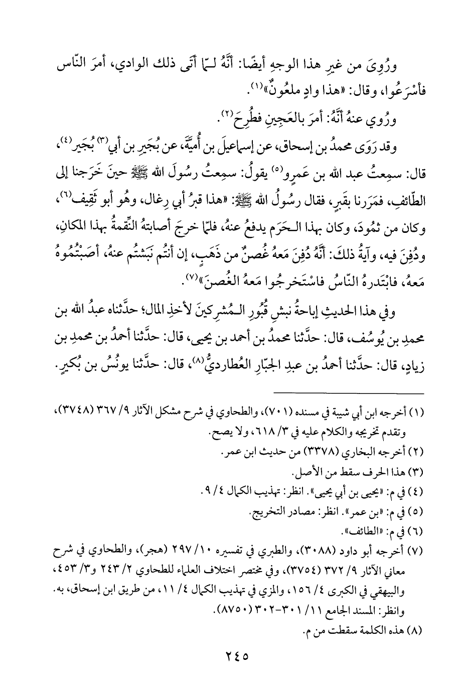 وفي هذا الحديثِ إباحةُ نبشِ قُبُورِ المُشرِكينَ لأخذِ المال؛ حدَّثناه عبدُ الله بن محمدِ بن يُوسُف، قال: حدَّثنا محمدُ بن أحمد بن يحيى، قال: حدَّثنا أحمدُ بن محمدِ بن زيادٍ، قال: حدَّثنا أحمدُ بن عبدِ الجبّارِ العُطارديُّ (¬٨)، قال: حدَّثنا يونُسُ بن بُكيرٍ.