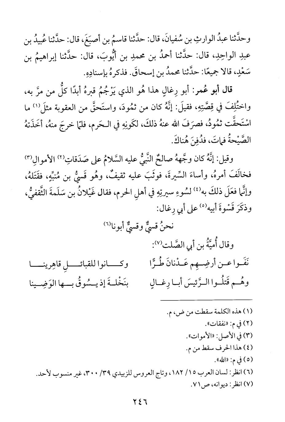 وقيل: إنَّهُ كان وجَّههُ صالحٌ النَّبيُّ عليه السَّلامُ على صَدَقاتِ (¬٢) الأموالِ (¬٣) فخالَفَ أمرهُ، وأساءَ السِّيرةَ، فوثَبَ عليه ثقيفٌ، وهُو قَسيُّ بن مُنبِّهٍ، فقَتَلهُ، وإنَّما فعَلَ ذلكَ به (¬٤) لسُوءِ سيرتهِ في أهلِ الحرم، فقال غَيْلانُ بن سَلَمةَ الثَّقفيُّ، وذكَرَ قَسْوةَ أبيه (¬٥) على أبي رِغال: