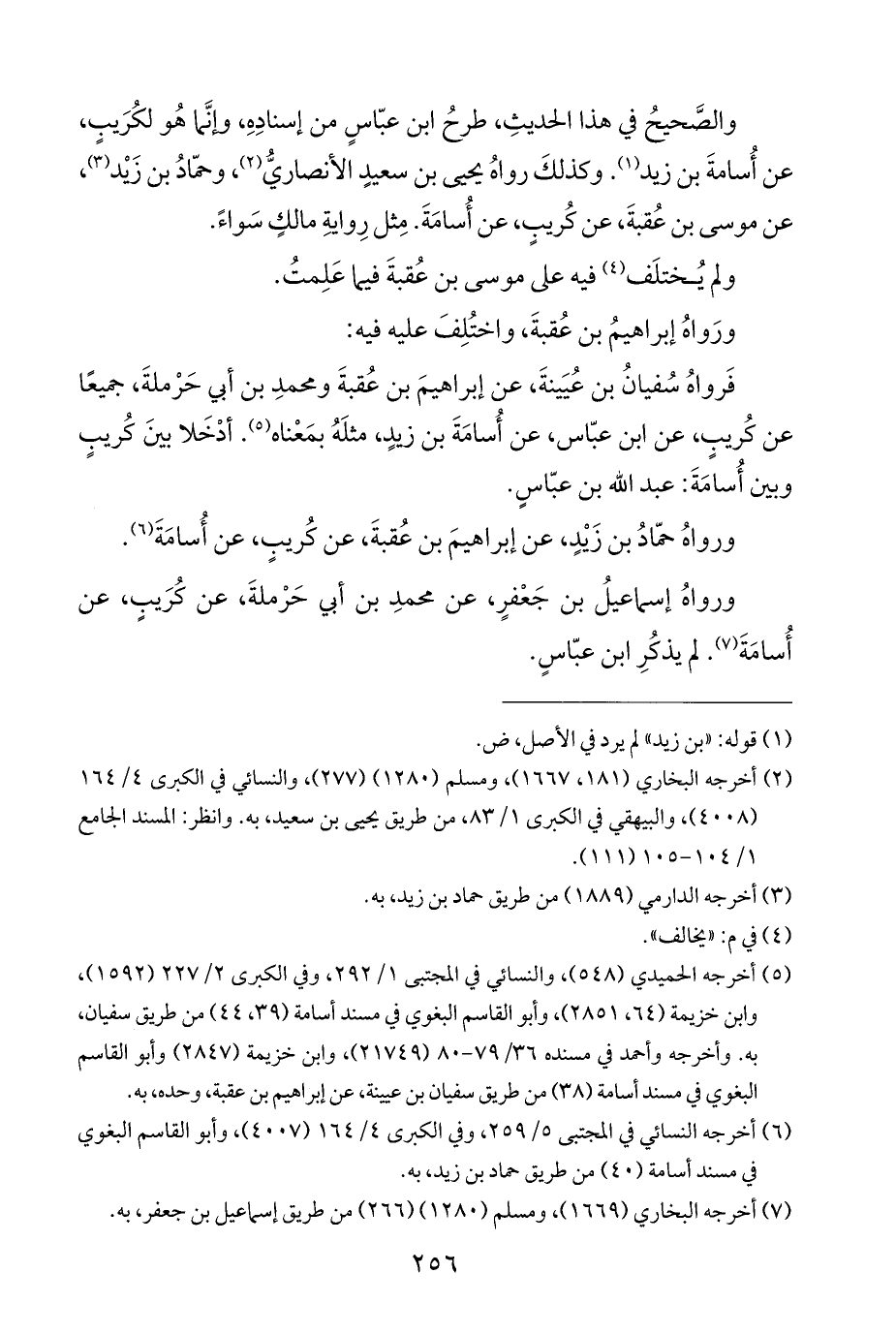 فَرواهُ سُفيانُ بن عُيَينةَ، عن إبراهيمَ بن عُقبةَ ومحمدِ بن أبي حَرْملةَ، جميعًا عن كُريبٍ، عن ابن عبّاس، عن أُسامَةَ بن زيدٍ، مثلَهُ بمَعْناه (¬٥). أدْخَلا بينَ كُريبٍ وبين أُسامَةَ: عبد الله بن عبّاسٍ.