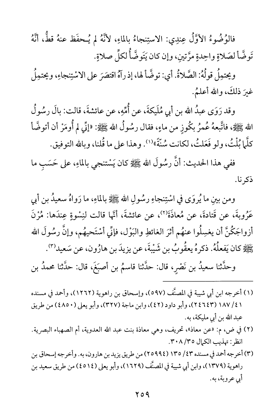 ومن بينِ ما يُروَى في استِنجاءِ رسُولِ الله - صلى الله عليه وسلم - بالماءِ، ما رَواهُ سعيدُ بن أبي عَرُوبةَ، عن قَتادةَ، عن مُعاذَةَ (¬٢)، عن عائشةَ، أنَّها قالت لنِسْوةٍ عِندَها: مُرْنَ أزواجَكُنَّ أن يغسِلُوا عنهُم أثرَ الغائطِ والبَوْل، فإنِّي أسْتَحيهُم، وإنَّ رسُولَ الله - صلى الله عليه وسلم - كان يَفعلُهُ. ذكرهُ يعقُوبُ بن شَيْبةَ، عن يزيدَ بن هارُون، عن سَعيد (¬٣).