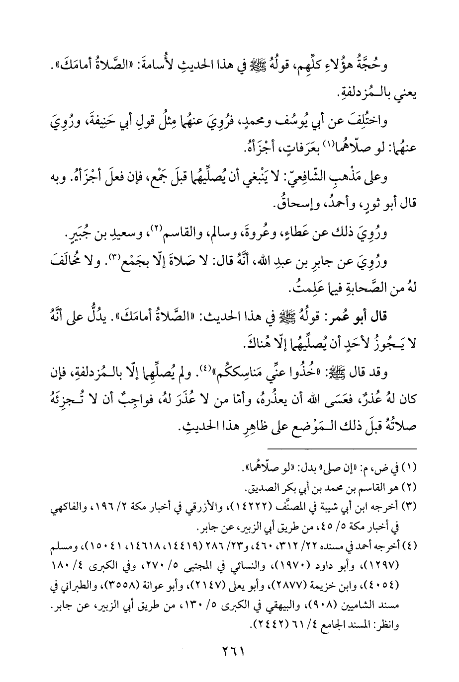 وحُجَّةُ هؤُلاءِ كلِّهِم، قولُهُ - صلى الله عليه وسلم - في هذا الحديثِ لأُسامةَ: "الصَّلاةُ أمامَكَ". يعني بالمُزدلفةِ.