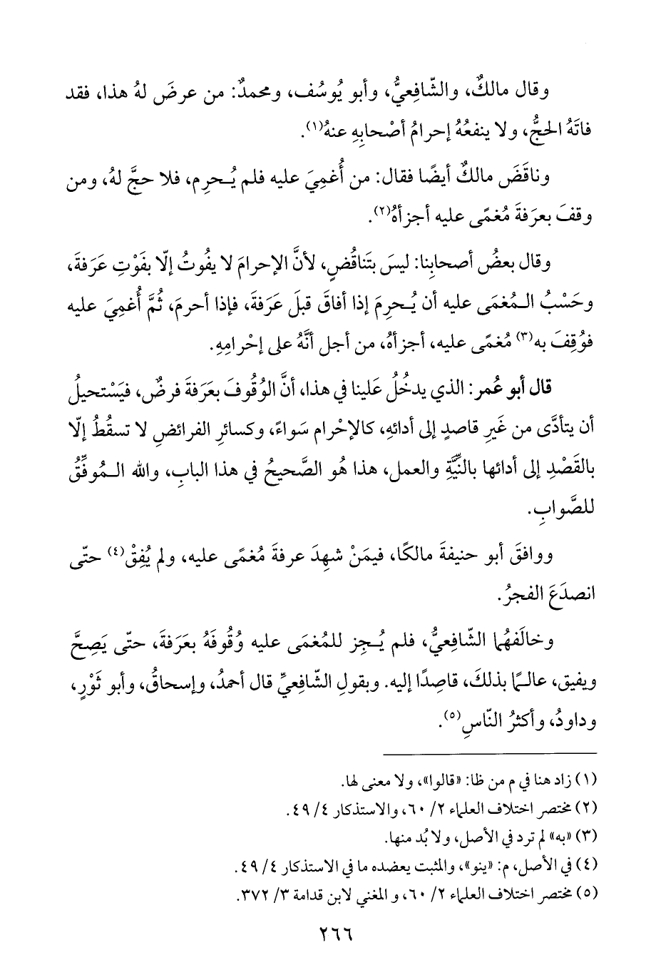 وقال بعضُ أصحابِنا: ليسَ بتَناقُضٍ، لأنَّ الإحرامَ لا يفُوتُ إلّا بفَوْتِ عَرَفةَ، وحَسْبُ المُغمَى عليه أن يُحرِمَ إذا أفاقَ قبلَ عَرَفةَ، فإذا أحرمَ، ثُمَّ أُغمِيَ عليه فوُقِفَ به (¬٣) مُغمًى عليه، أجزأهُ، من أجل أنَّهُ على إحْرامِهِ.