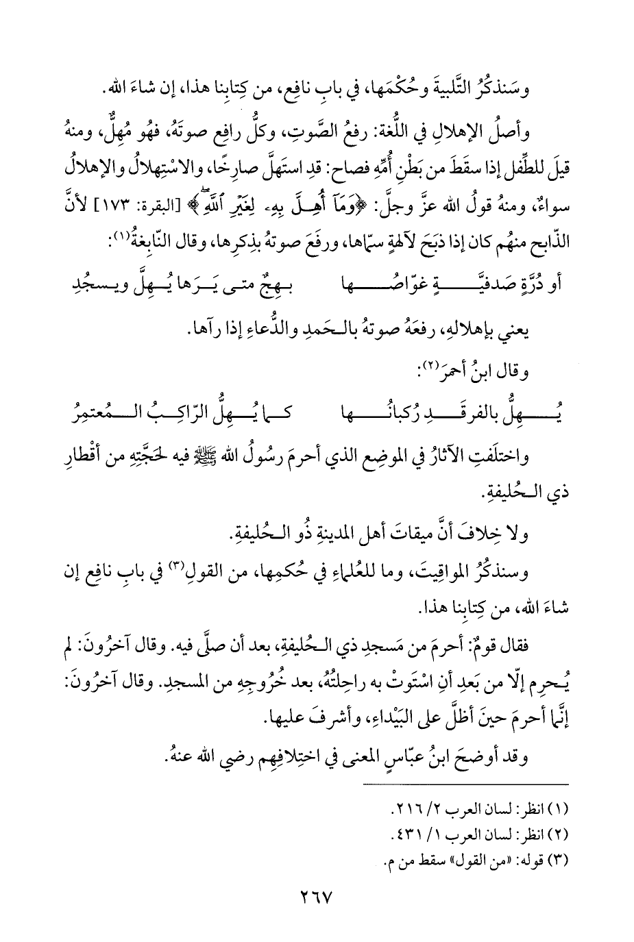 وسَنذكُرُ التَّلبيةَ وحُكْمَها، في بابِ نافِع، من كِتابِنا هذا، إن شاءَ الله.