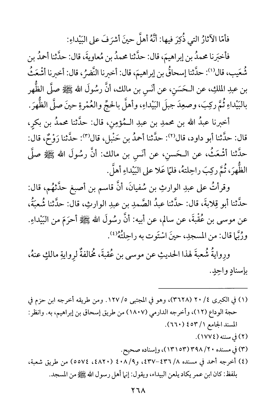 وقرأتُ على عبدِ الوارثِ بن سُفيانَ، أنَّ قاسم بن أصبغ حدَّثهُم، قال: حدَّثنا أبو قِلابةَ، قال: حدَّثنا عبدُ الصمدِ بن عبدِ الوارثِ، قال: حدَّثنا شُعبَةُ، عن موسى بن عُقْبةَ، عن سالم، عن أبيه: أنَّ رسُولَ الله - صلى الله عليه وسلم - أحرَمَ من البَيْداءِ. ورُبَّما قال: من المسجدِ، حينَ اسْتَوت به راحِلتُهُ (¬٤).