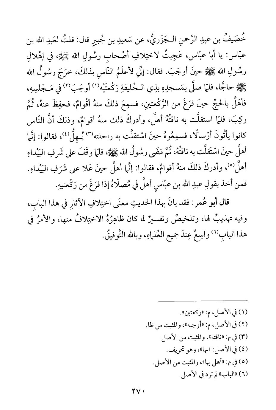 خُصَيفُ بن عبدِ الرَّحمنِ الجَزَريُّ، عن سَعيدِ بن جُبيرٍ قال: قلتُ لعَبدِ الله بن عبّاس: يا أبا عبّاس، عَجِبتُ لاختِلافِ أصْحابِ رسُولِ الله - صلى الله عليه وسلم -، في إهْلالِ رسُولِ الله - صلى الله عليه وسلم - حينَ أوجَبَ. فقال: إنِّي لأعلَمُ النّاسِ بذلكَ، خرَجَ رسُولُ الله - صلى الله عليه وسلم - حاجًّا، فلمّا صلَّى بمَسجدِهِ بذِي الحُليفةِ رَكْعتَيْه (¬١) أوجَبَ (¬٢) في مَجْلسِهِ، فأهَلَّ بالحجِّ حينَ فرَغَ من الرَّكْعتينِ، فسمِعَ ذلكَ منهُ أقْوامٌ، فحفِظَ عنهُ، ثُمَّ ركِبَ، فلمّا استقلَّت به ناقتُهُ أهلَّ، وأدركَ ذلك منهُ أقوامٌ، وذلكَ أنَّ النّاس كانوا يأتُونَ أرْسالًا، فسمِعُوهُ حينَ اسْتقلَّت به راحلته (¬٣) يُهِلُّ (¬٤)، فقالوا: إنَّما أهلَّ حينَ اسْتَقلَّت به ناقتُهُ، ثُمَّ مَضَى رسُولُ الله - صلى الله عليه وسلم -، فلمّا وقَفَ على شرفِ البَيْداءِ أهلَّ (¬٥)، وأدركَ ذلكَ منهُ أقوامٌ، فقالوا: إنَّما أهلَّ حينَ عَلا على شَرَفِ البَيْداءِ. فمن أخذ بقولِ عبدِ الله بن عبّاسٍ أهلَّ في مُصلّاهُ إذا فرَغَ من رَكْعتيهِ.