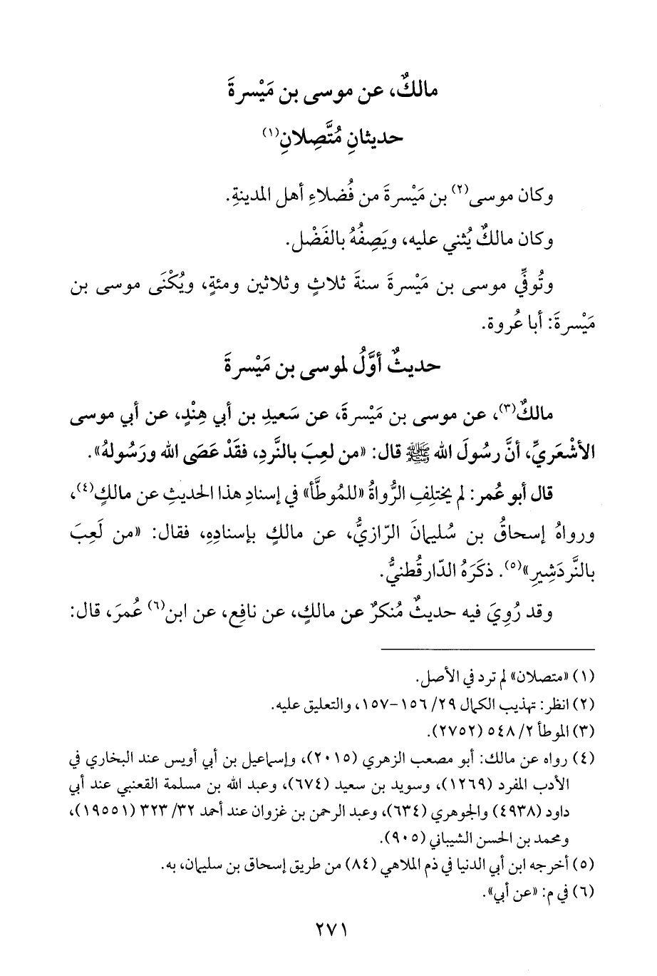 مالكٌ (¬٣)، عن موسى بن مَيْسرةَ، عن سَعيدِ بن أبي هِنْدٍ، عن أبي موسى الأشْعَريِّ، أنَّ رسُولَ الله - صلى الله عليه وسلم - قال: "من لعِبَ بالنَّردِ، فقَدْ عَصَى الله ورَسُولهُ".