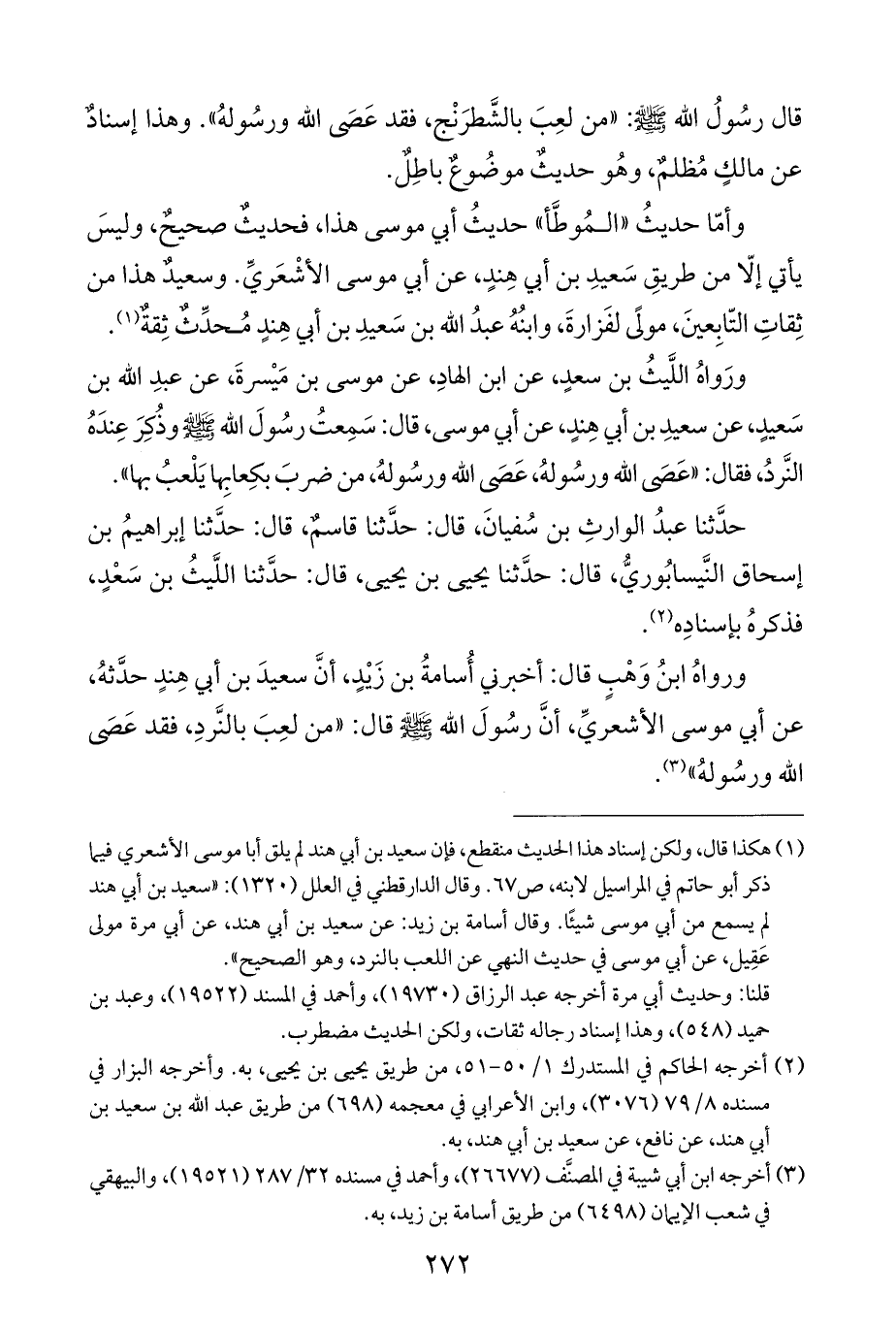 ورَواهُ اللَّيثُ بن سعدٍ، عن ابن الهادِ، عن موسى بن مَيْسرةَ، عن عبدِ الله بن سَعيدٍ، عن سعيدِ بن أبي هِندٍ، عن أبي موسى، قال: سَمِعتُ رسُولَ الله - صلى الله عليه وسلم - وذُكِرَ عِندَهُ النَّردُ، فقال: "عَصَى الله ورسُولهُ، عَصَى الله ورسُولهُ، من ضربَ بكِعابِها يَلْعبُ بها".