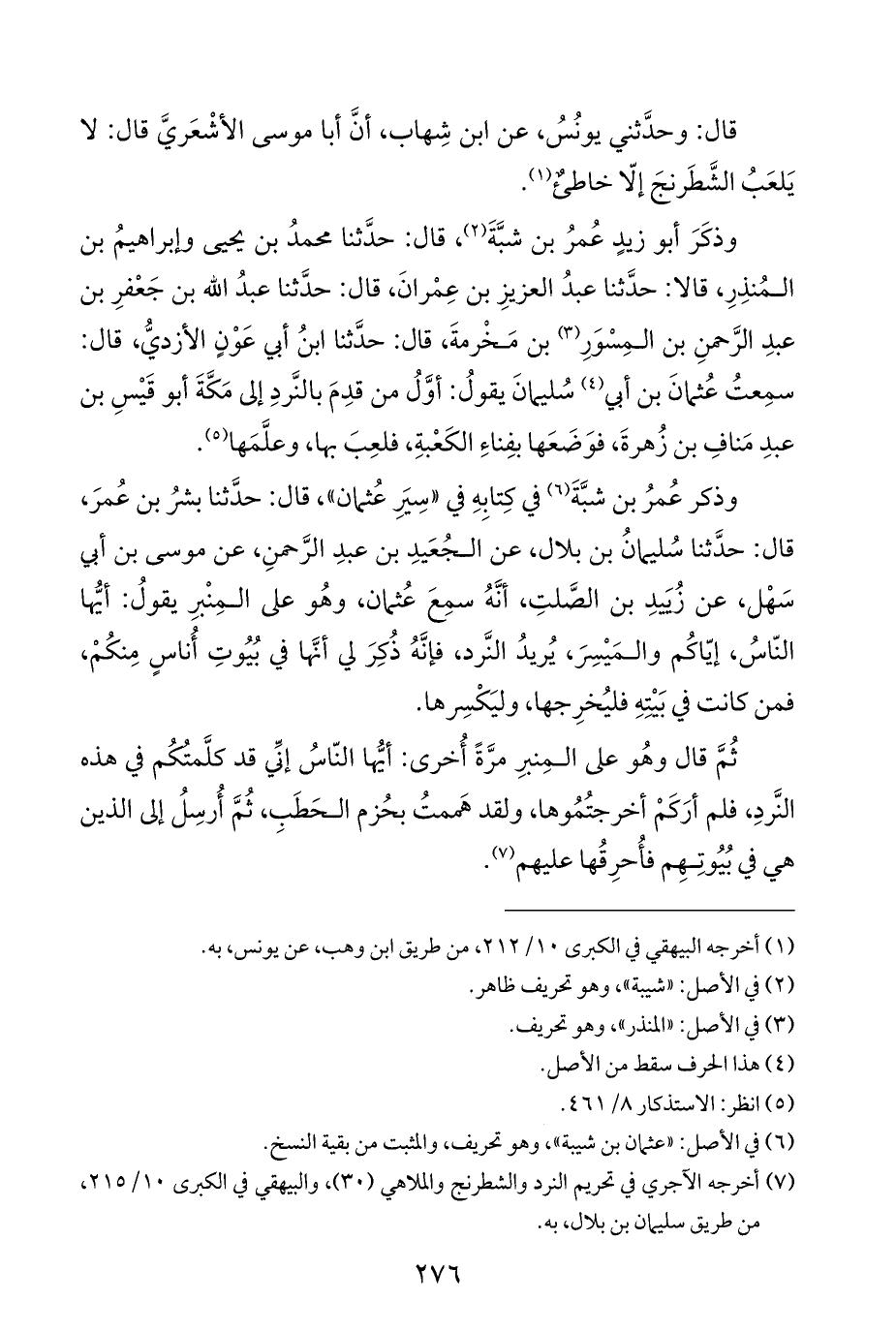 وذكر عُمرُ بن شبَّةَ (¬٦) في كِتابِهِ في "سِيَرِ عُثمان"، قال: حدَّثنا بشرُ بن عُمرَ، قال: حدَّثنا سُليمانُ بن بلال، عن الجُعَيدِ بن عبدِ الرَّحمنِ، عن موسى بن أبي سهْل، عن زُيَيدِ بن الصَّلتِ، أنَّهُ سمِعَ عُثمان، وهُو على المِنْبرِ يقولُ: أيُّها النّاسُ، إيّاكُم والمَيْسِرَ، يُريدُ النَّرد، فإنَّهُ ذُكِرَ لي أنَّها في بُيُوتِ أُناسٍ مِنكُمْ، فمن كانت في بَيْتِهِ فليُخرِجها، وليَكْسِرها.