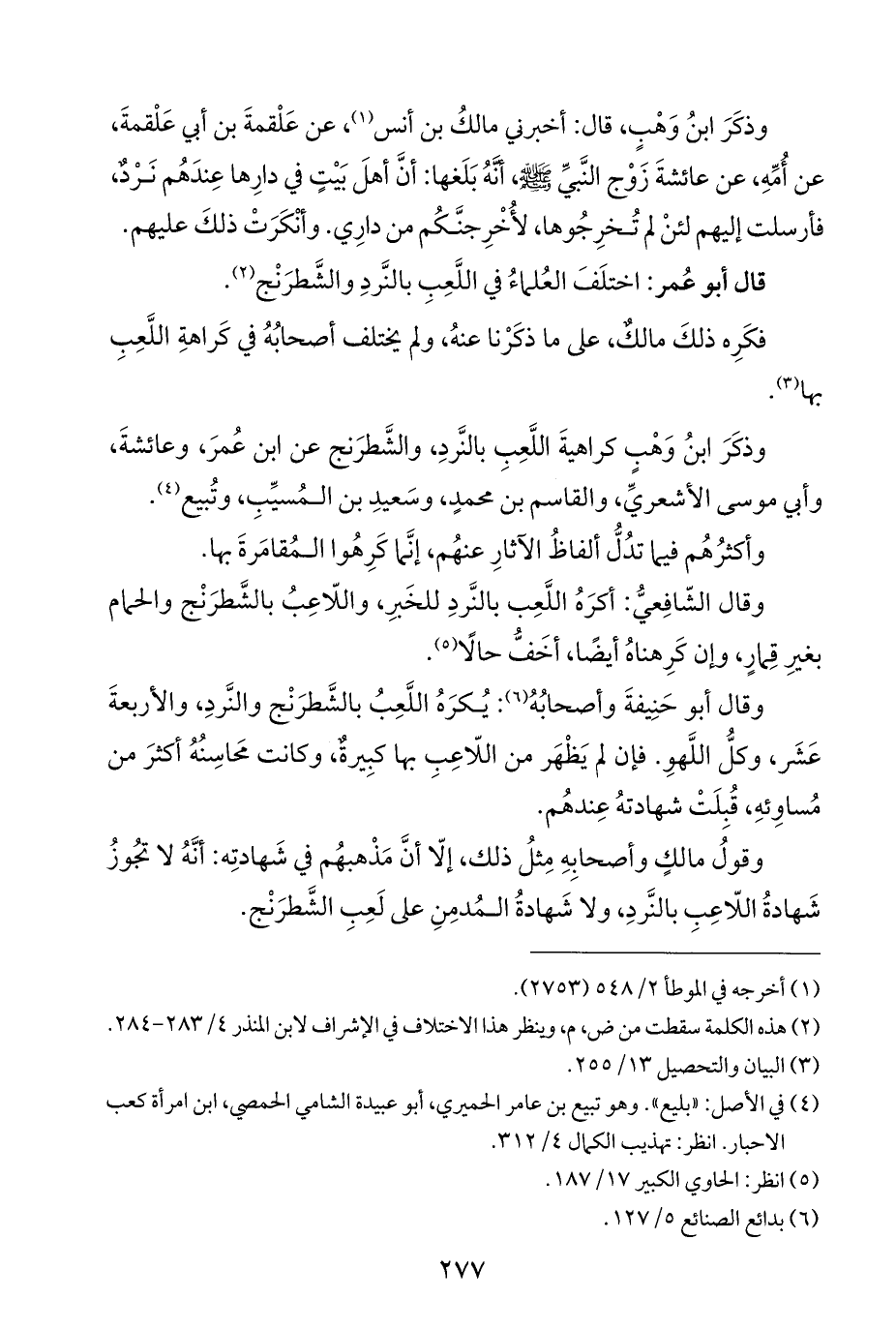 وقولُ مالكٍ وأصحابِهِ مِثلُ ذلك، إلّا أنَّ مَذْهبهُم في شَهادتِه: أنَّهُ لا تجُوزُ شَهادةُ اللّاعِبِ بالنَّردِ، ولا شَهادةُ المُدمِنِ على لَعِبِ الشَّطرَنْج.