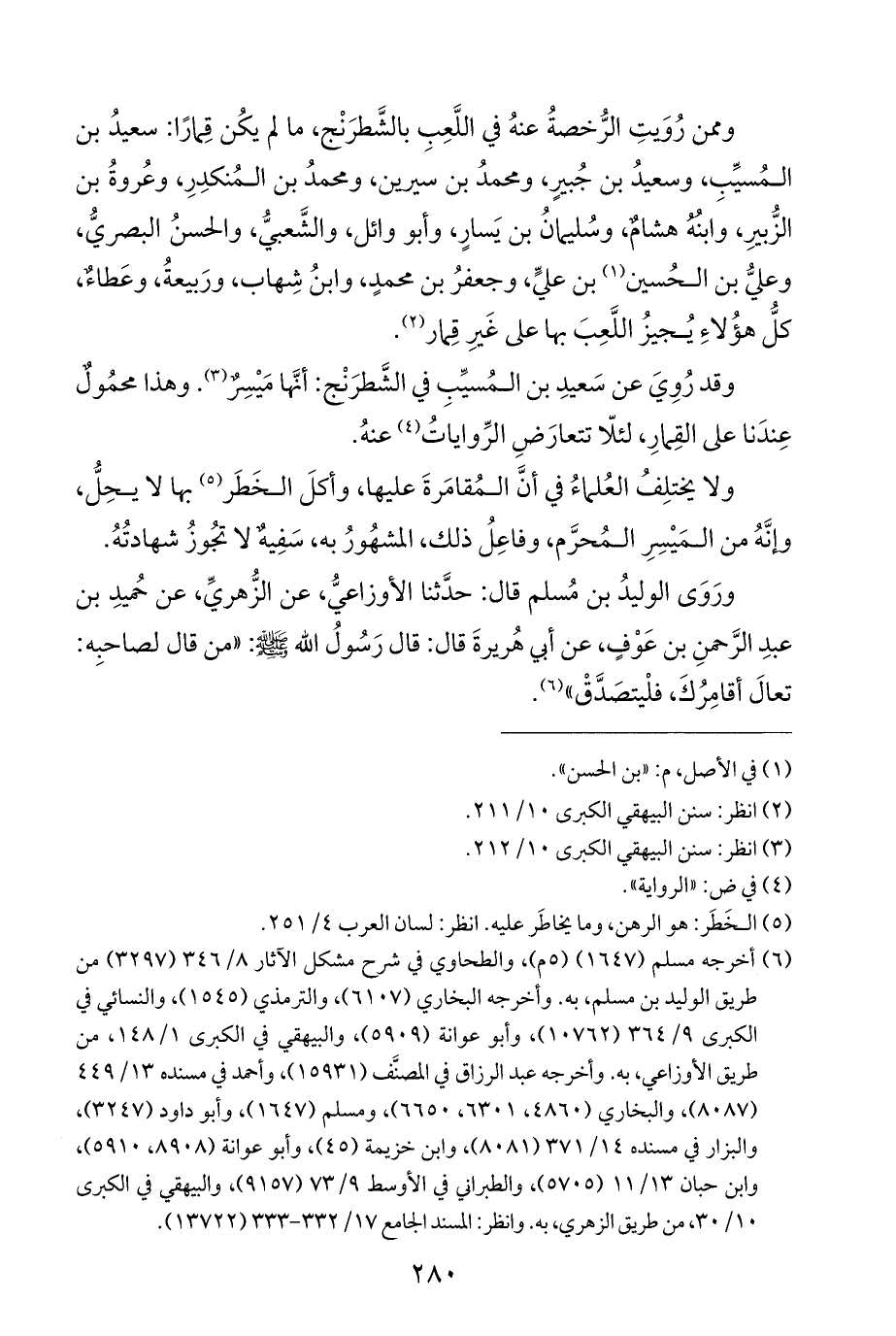 وقد رُوِيَ عن سَعيدِ بن المُسيِّبِ في الشَّطرَنْج: أنَّها مَيْسِرٌ (¬٣). وهذا محمُولٌ عِندَنا على القِمارِ، لئلّا تتعارَضِ الرِّواياتُ (¬٤) عنهُ.