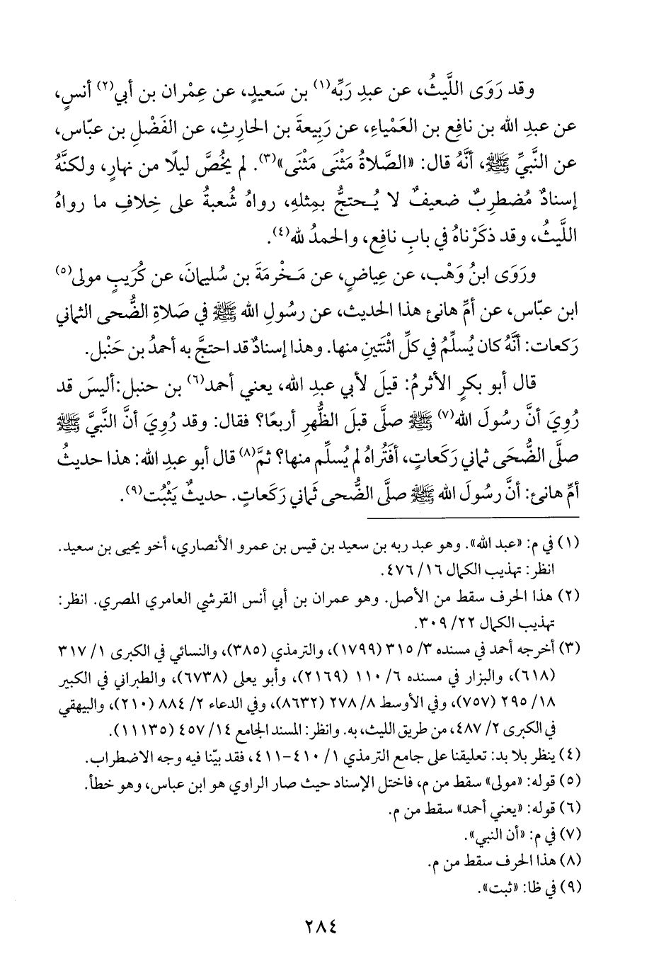 قال أبو بكرٍ الأثرمُ: قيلَ لأبي عبدِ الله، يعني أحمد (¬٦) بن حنبل: أليسَ قد رُوِيَ أنَّ رسُولَ الله (¬٧) - صلى الله عليه وسلم - صلَّى قبلَ الظُّهرِ أربعًا؟ فقال: وقد رُوِيَ أنَّ النَّبيَّ - صلى الله عليه وسلم - صلَّى الضُّحَى ثماني رَكَعاتٍ، أفَتُراهُ لم يُسلِّم منها؟ ثمَّ (¬٨) قال أبو عبدِ الله: هذا حديثُ أمِّ هانئ: أنَّ رسُولَ الله - صلى الله عليه وسلم - صلَّى الضُّحى ثَماني رَكَعاتٍ. حديثٌ يَثْبُت (¬٩).
