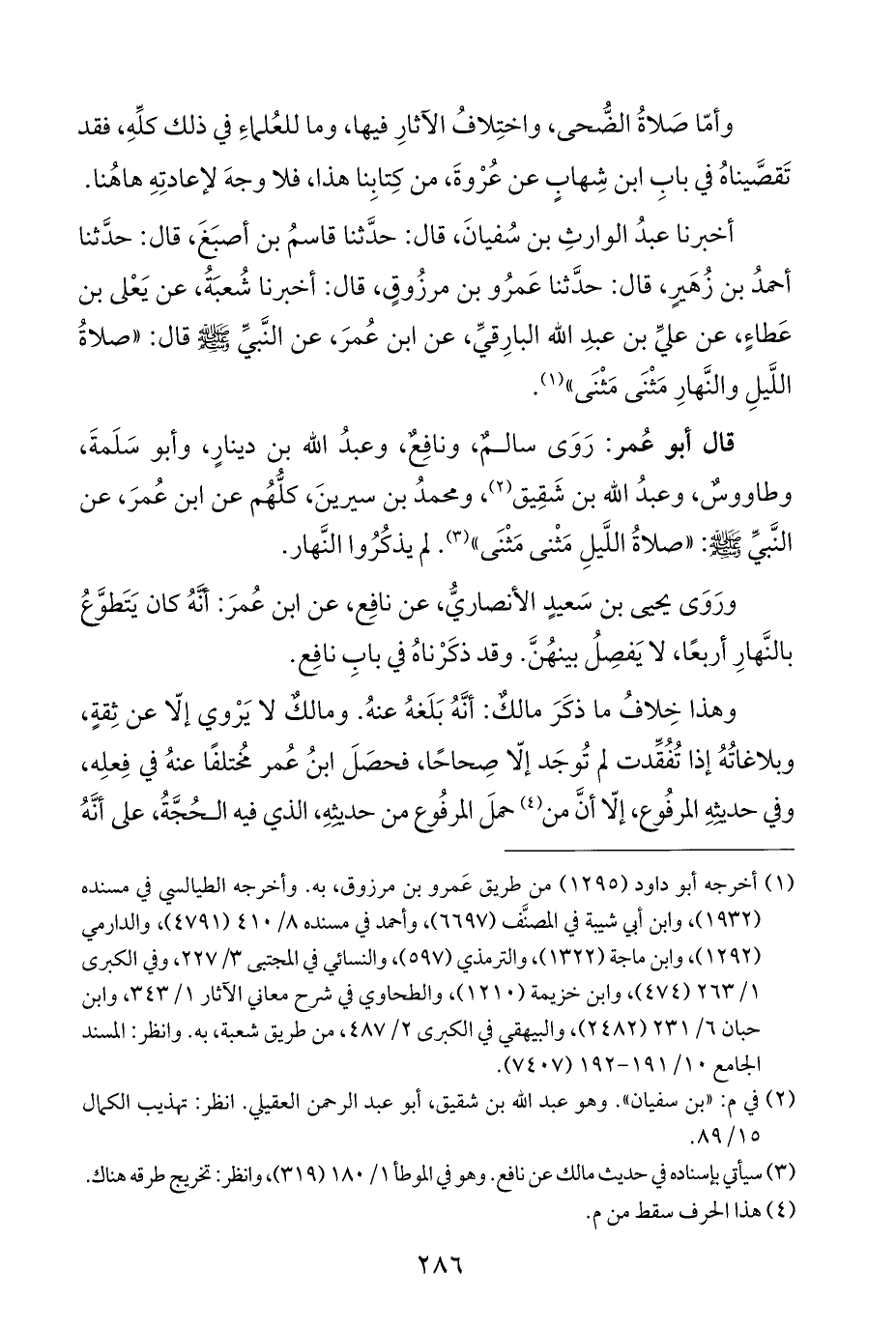 قال أبو عُمر: رَوَى سالمٌ، ونافِعٌ، وعبدُ الله بن دينارٍ، وأبو سَلَمةَ، وطاووسٌ، وعبدُ الله بن شَقِيق (¬٢)، ومحمدُ بن سيرينَ، كلّهُم عن ابن عُمرَ، عن النَّبيِّ - صلى الله عليه وسلم -: "صلاةُ اللَّيلِ مَثْنى مَثْنَى" (¬٣). لم يذكُرُوا النَّهار.